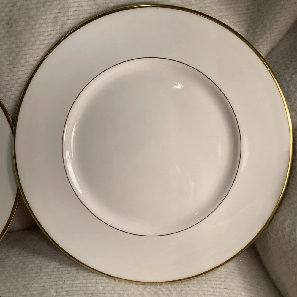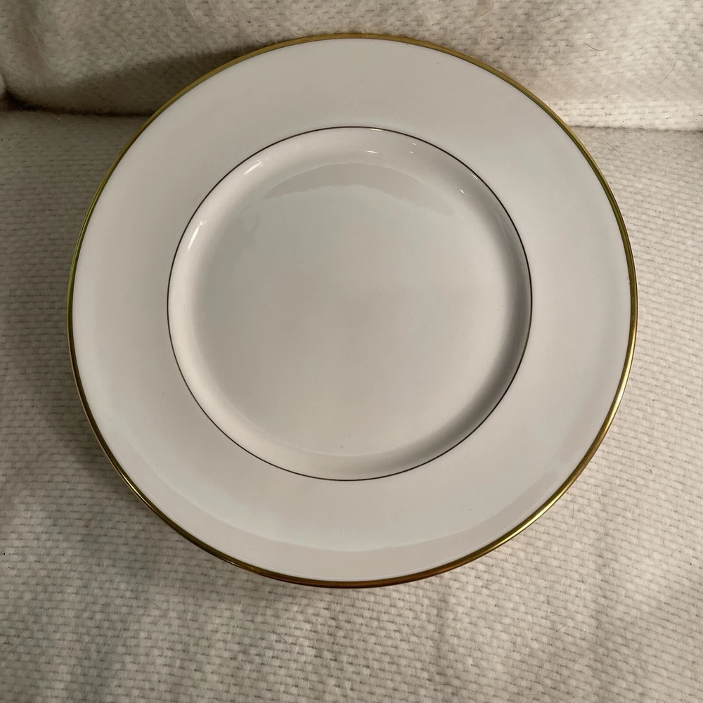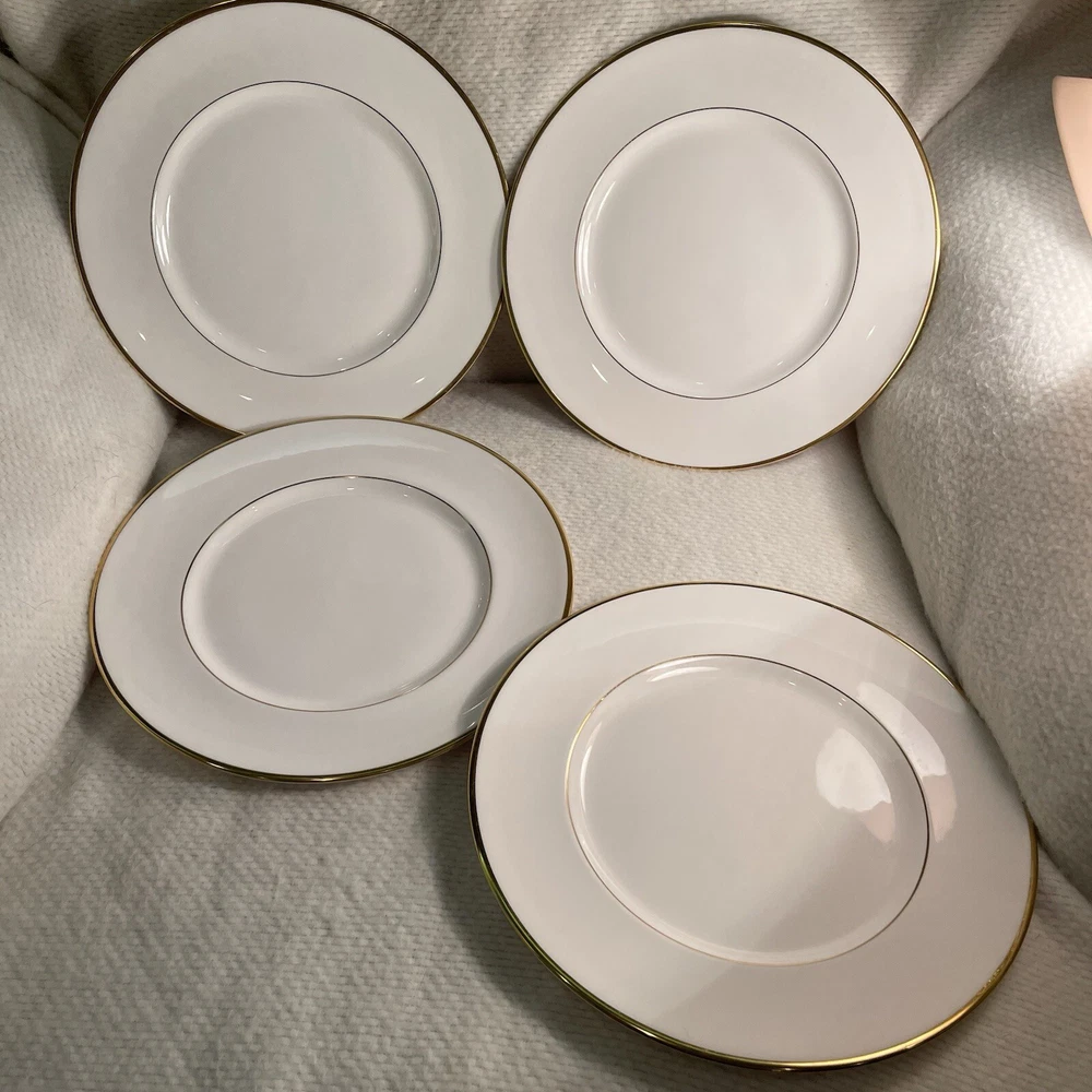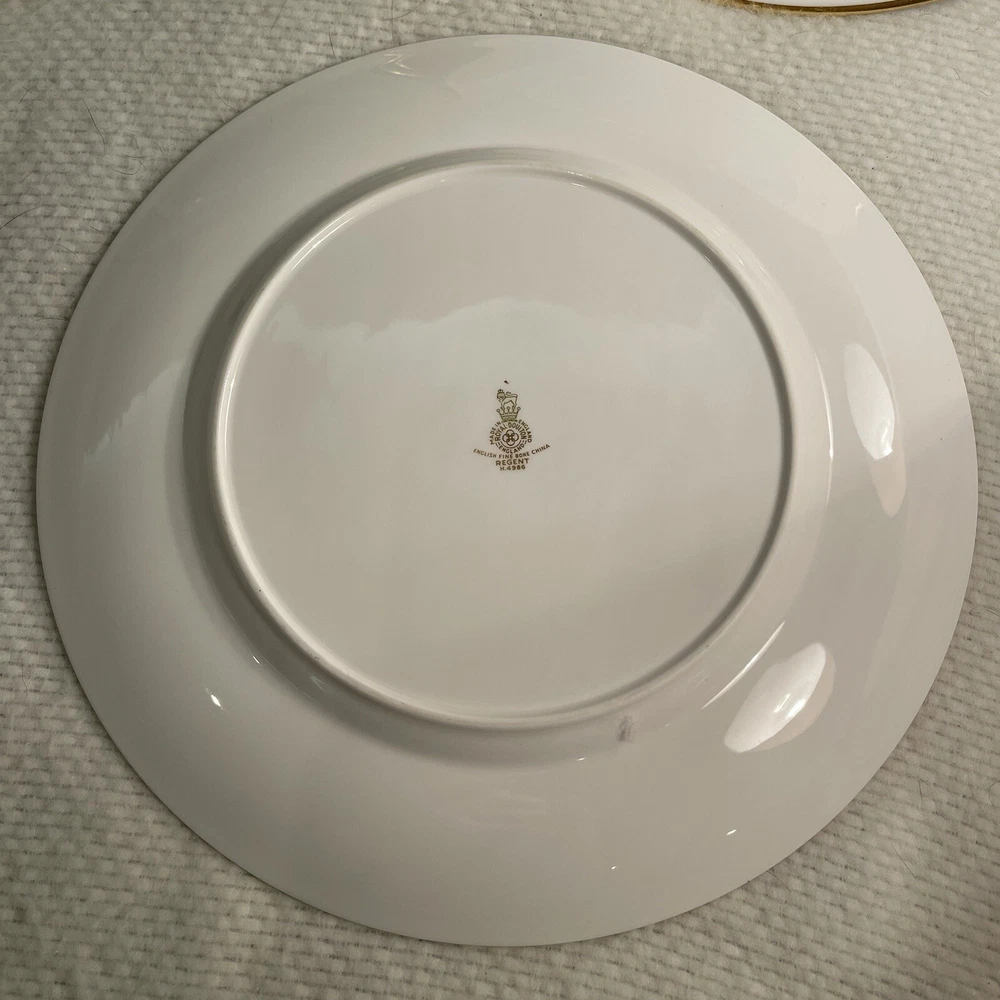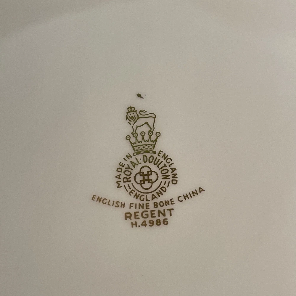 Elevate your dining experience with this exquisite set of four Royal Doulton Regent dinner plates. Crafted in England from fine bone china and featuring a luxurious gold rim, these plates are perfect for any occasion, including Christmas. The contemporary style and elegant ivory color make them a beautiful addition to your table setting. Each plate in this set measures 10.75 inches in diameter, weighs 4.12 lbs, and features a printed backstamp. The glossy finish and decorative design add a touch of sophistication to your dining experience. Whether you're hosting a formal dinner party or enjoying a casual meal with family, these plates are sure to impress. Excellent condition. Just like new. No chips or cracks.