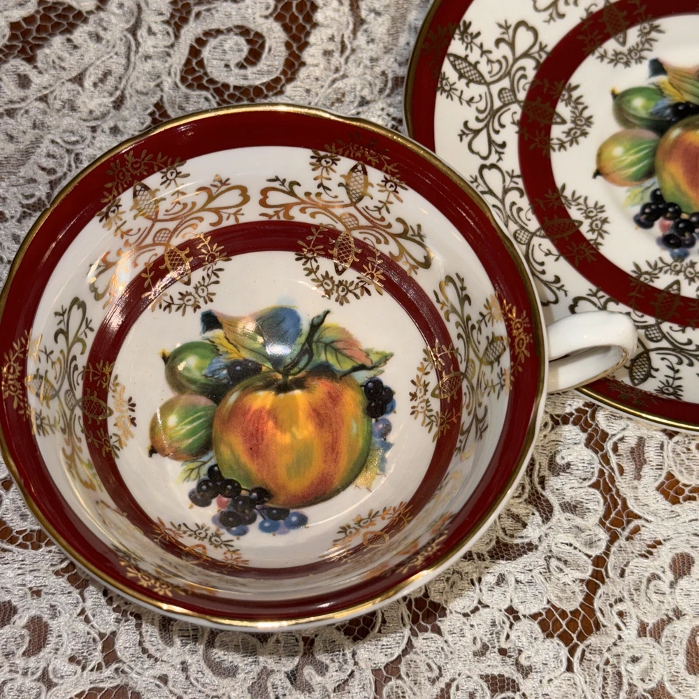 Sought after elegant burgundy tea cup and saucer set features a mix of peach or apple with blueberries and elderberries, all accented with gold. The set is made of fine bone china and was crafted in England Please let me know if you have any questions Check out the other teacups and saucers offered for sale in my store for sales and new inventory coming soon