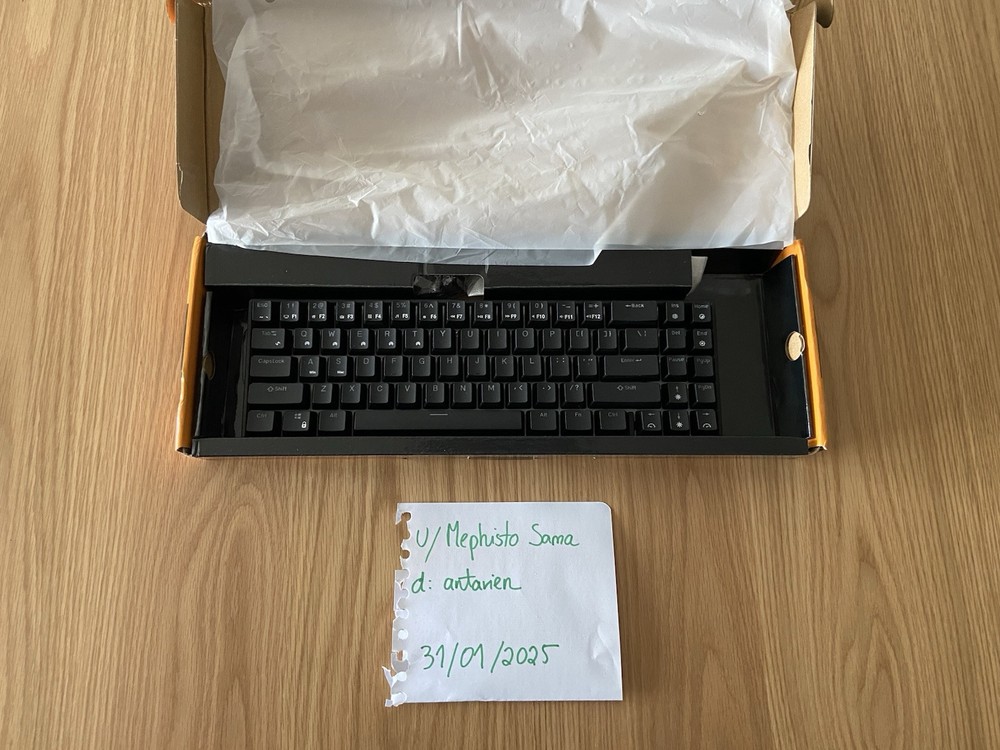 Keyboard has been faily but not that much. It is in very good conditions. On the back of the keyboard, there is a hole for a wirless dongle, but unfortunately it come with any when I purchased. Noticable features: Detachable Feet Hotswappable with 5 pin switches Wireless by bluetooth USB-C cable included Side and back lighting that can be customized without a program