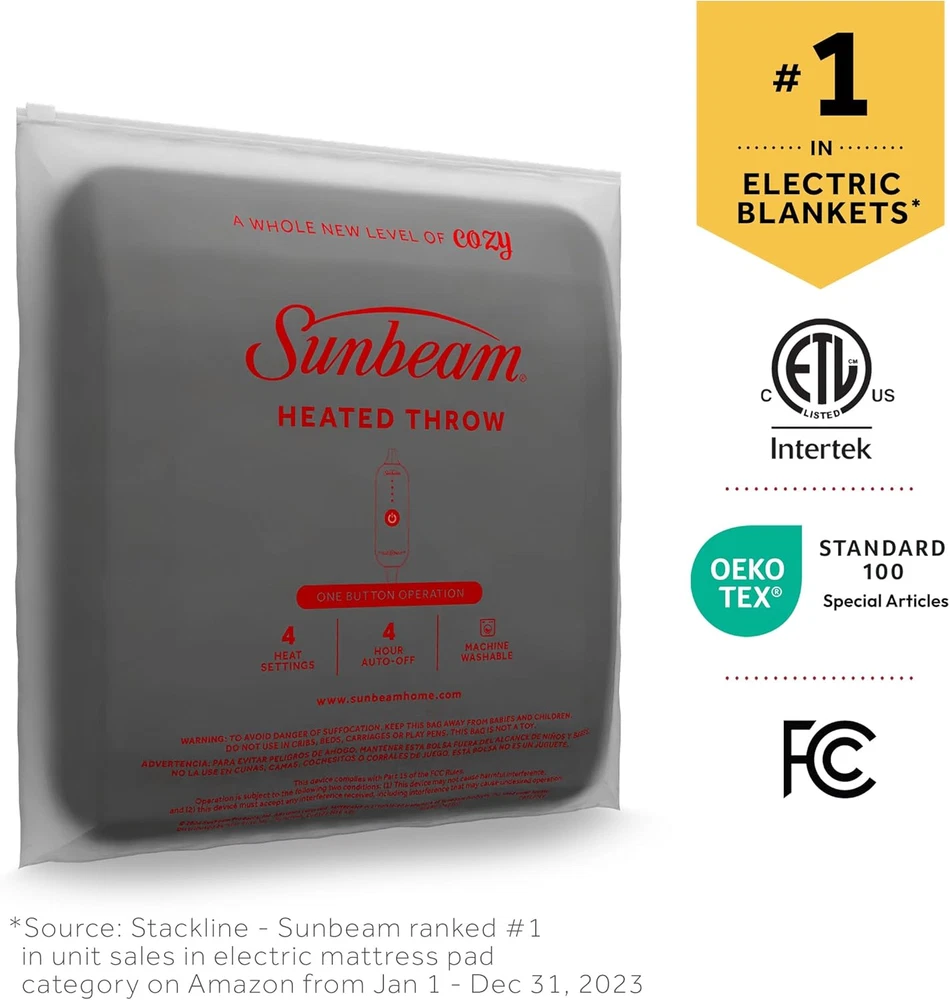 Polyester Easy to use electric throw with push button controller, with 4 heat settings and 4-hour auto-shut off function for peace of mind Luxurious and ultra comfy royal mink with reverse sherpa material for added warmth and comfort, stylish dark grey color 50" x 60", ideal size to snuggle up in Makes a great accessory while relaxing on couch, bed or your favorite chair Machine washable and dryer safe for easy care, 100% Polyester Snuggle up with the Sunbeam Royal Mink Sherpa Heated Throw to beat those winter chills. Indulge yourself with its luxurious and ultra comfy material with reverse side sherpa to keep you toasty all night long or warm as you unwind. Easy to use detachable controller with 4 heat settings and a 4-hour auto-shut off feature for peace of mind. Remove the controller and place the blanket into the washer and dryer for easy cleaning.