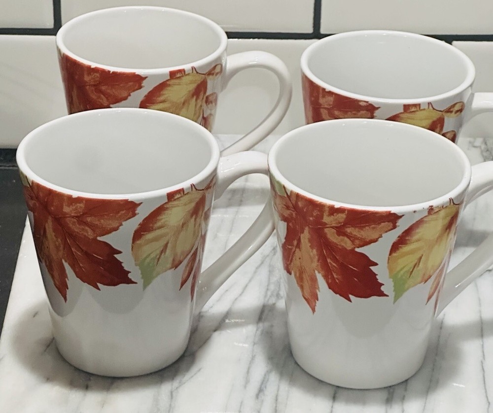 The set includes four medium-sized Royal Norfolk coffee cups featuring a contemporary design with painted leaves and acorns, perfect for Thanksgiving celebrations. The 12 oz ceramic cups are suitable for both hot and cold beverages and are decorated in a multicolor pattern. They are part of the Food & Drink theme, with a capacity to serve four individuals. These original coffee mugs are designed for unisex adults in a contemporary style, manufactured in 2023.
