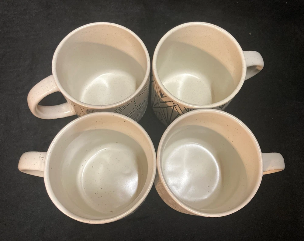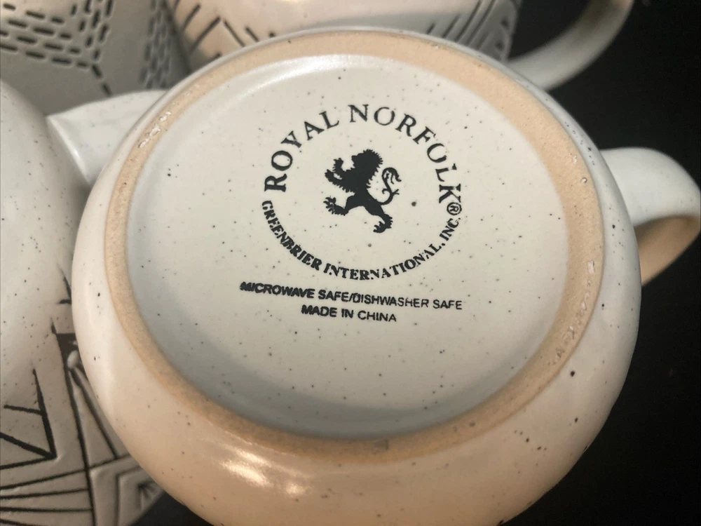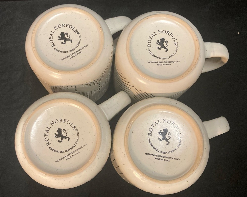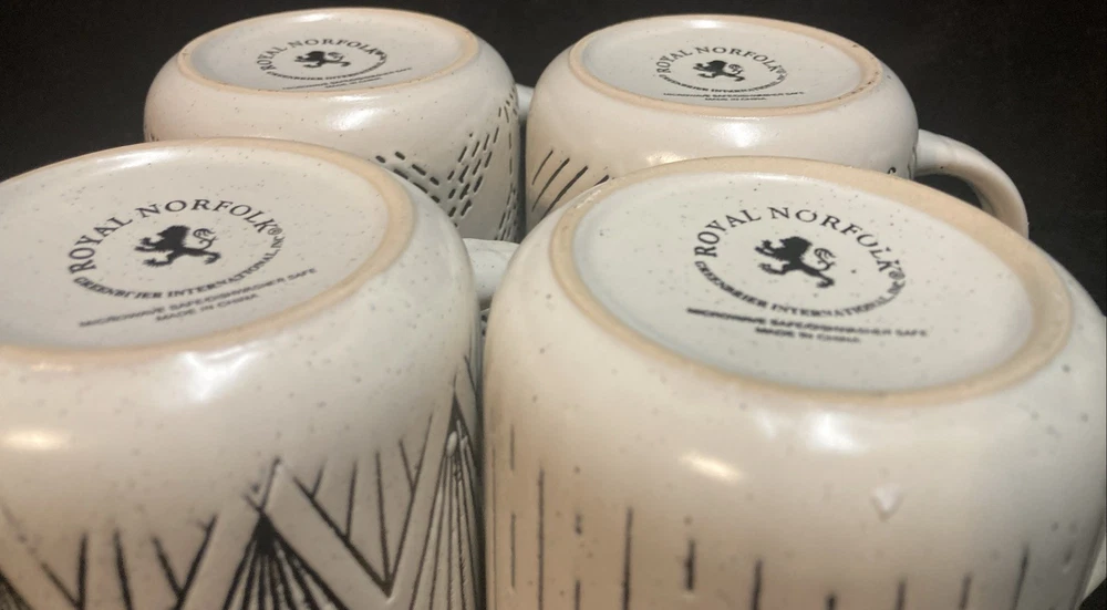 This set of four Royal Norfolk White Stoneware Coffee Mugs are a stylish and modern addition to any kitchen or dining area. This four-piece set features a white and black line pattern on round, 14oz mugs. The set is pre-owned but has never been used. It comes in very good, clean condition with no chips, cracks, or breaks. Please see pictures for details. If you have any questions or concerns, please do not hesitate to contact us. Check out our other items and message us if interested in more than one listing as combining items could save you money on shipping.
