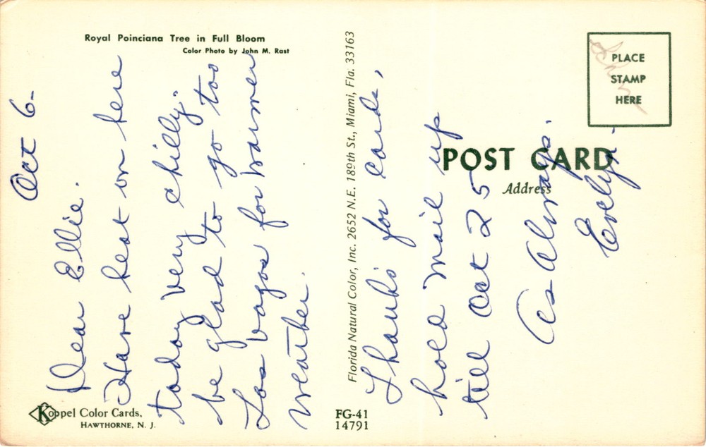 MAKE AN OFFER. THE MORE YOU BUY THE BETTER DEAL I WILL ACCEPT The postcard features a color photo of a Royal Poinciana tree in full bloom, taken by John M. Rast. The postcard is from Hawthorne, New Jersey, and is addressed to someone named Ellie. The sender mentions the chilly weather at their location and expresses a desire to be in Los Angeles for warmer weather.