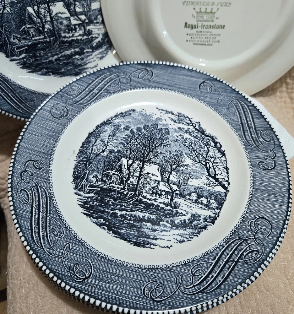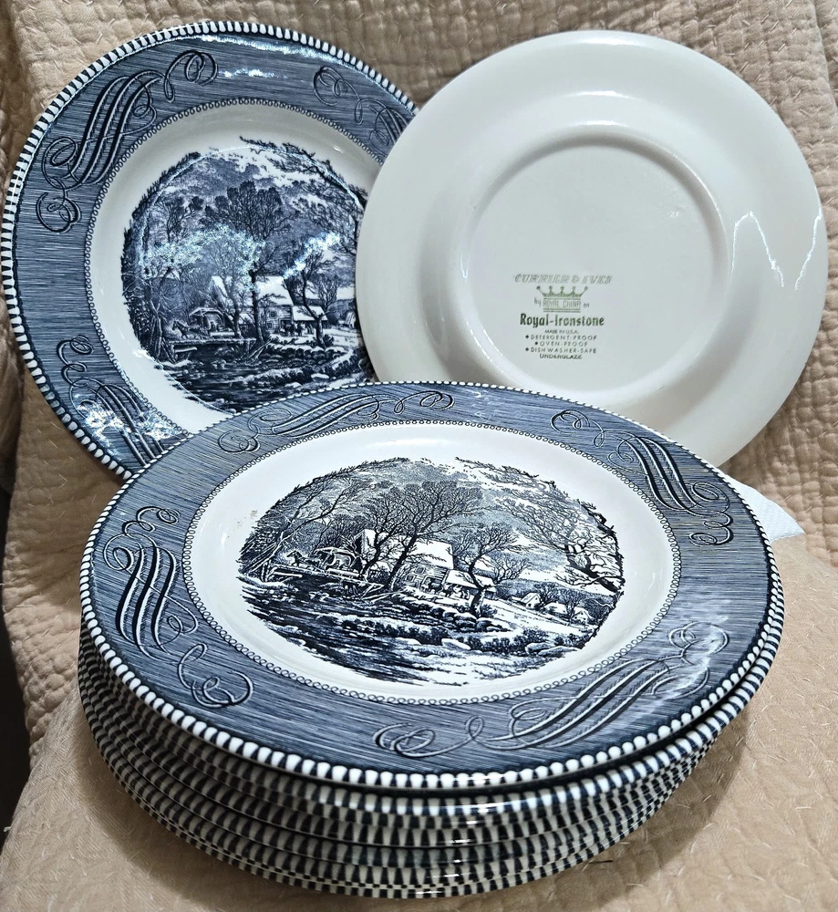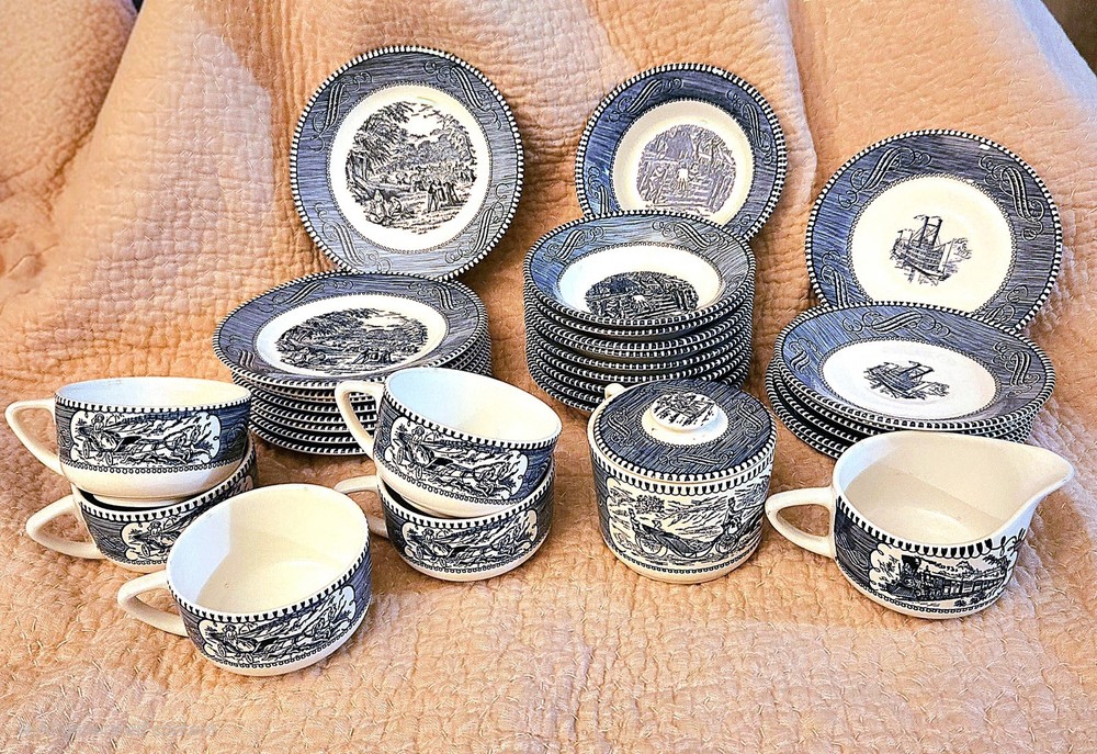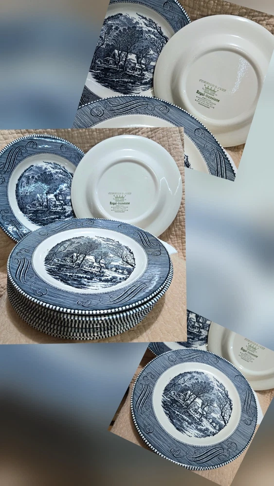The Currier & Ives Blue & White Collection "Old Grist Mill" By Royal is a vintage collector plate originating from the USA. Made of bone china and porcelain, this round plate features a blue and white color scheme with a Colonial style and Early American theme. Produced in the late 20th century, this oven-proof and dishwasher-safe plate showcases American culture and pottery techniques from the 1940-1970. Perfect for all occasions, this collector plate by Currier & Ives is a nostalgic addition to any decorative collection. 1 creamer, 1 sugar bowl set, 10 fruit/dessert sauce bowl, 9 bread & butter saucer, 2 blue mugs, 7 tea cup and saucer set, and 5 teacups, also If sold individually priced at over 400.00, get now all for 185.00. In excellent shape, just a beautiful collection. The teacups are made of bone china and are often part of a set that includes saucers with a different pattern, such as a riverboat design. These collectible pieces were first produced in the 1950s and continue to be popular today. Some dinnerware, including cups, can fetch higher prices. For example, a 21-piece set was listed at $550. Correction: lid to sugar has hairline crack , price listed is discounted to accommodate. Also including 1 blue mug with hairline and 1 chip.