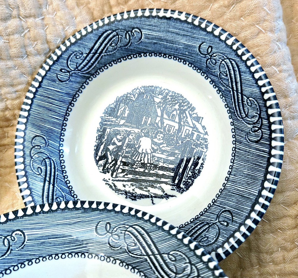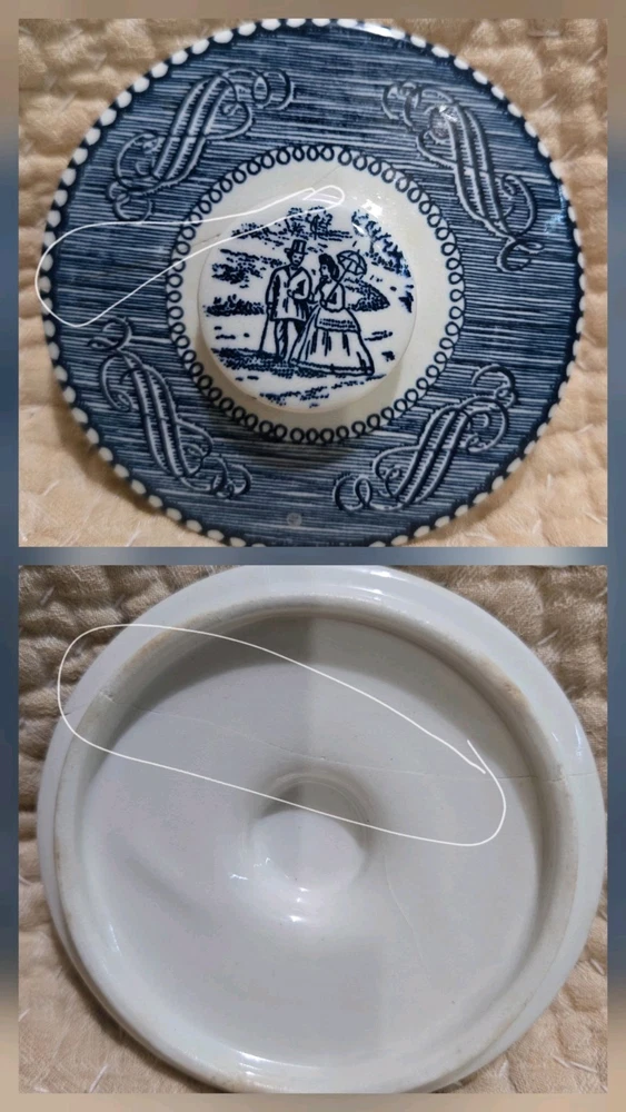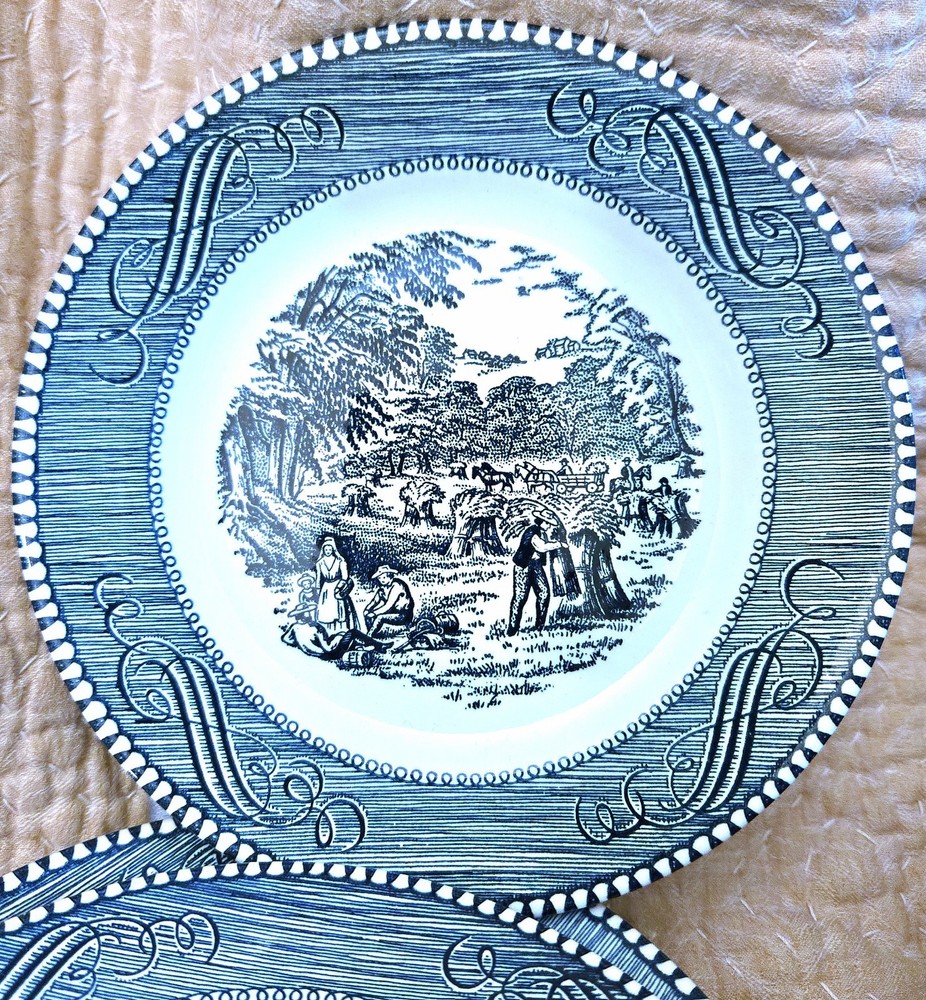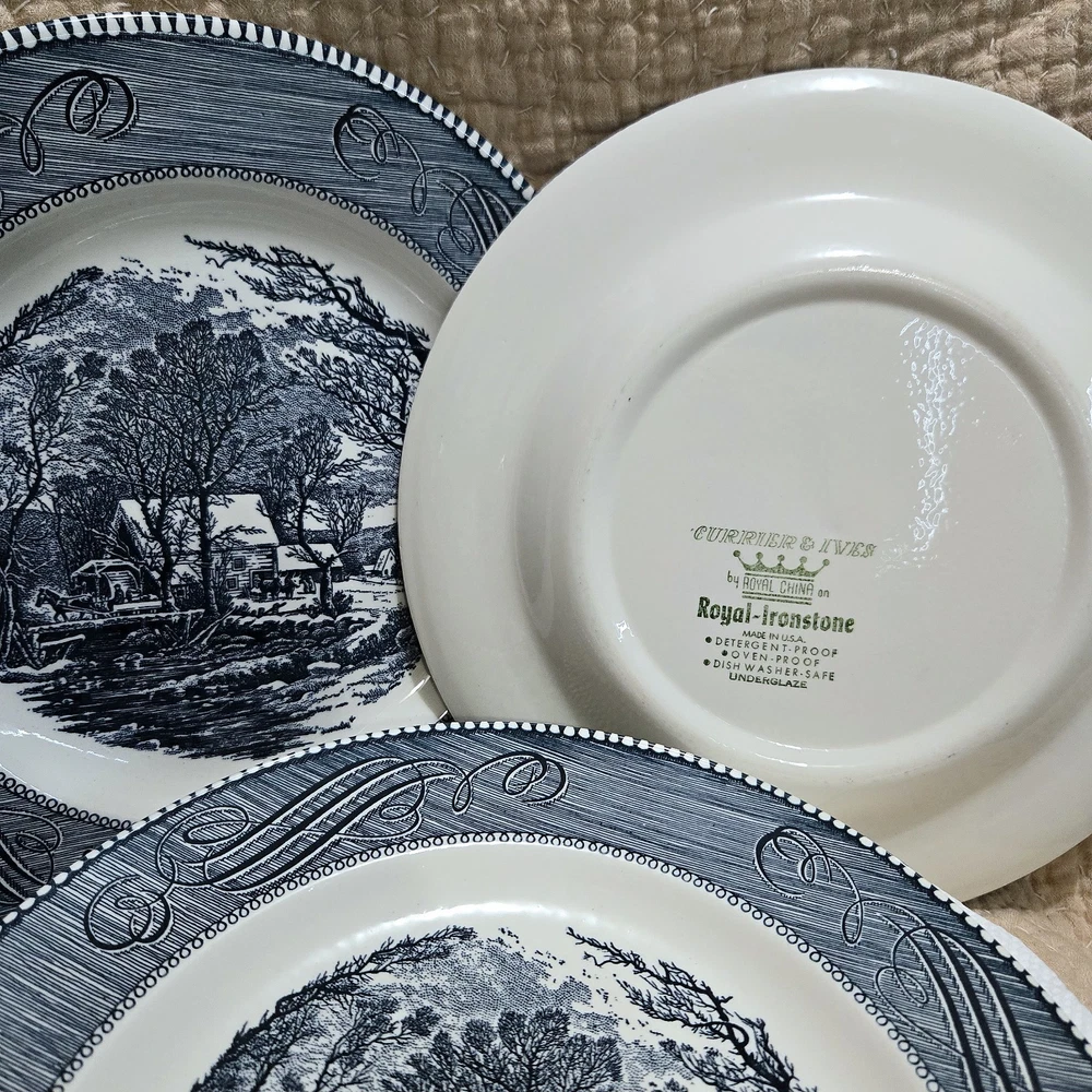 The Currier & Ives Blue & White Collection "Old Grist Mill" By Royal is a vintage collector plate originating from the USA. Made of bone china and porcelain, this round plate features a blue and white color scheme with a Colonial style and Early American theme. Produced in the late 20th century, this oven-proof and dishwasher-safe plate showcases American culture and pottery techniques from the 1940-1970. Perfect for all occasions, this collector plate by Currier & Ives is a nostalgic addition to any decorative collection. 1 creamer, 1 sugar bowl set, 10 fruit/dessert sauce bowl, 9 bread & butter saucer, 2 blue mugs, 7 tea cup and saucer set, and 5 teacups, also If sold individually priced at over 400.00, get now all for 185.00. In excellent shape, just a beautiful collection. The teacups are made of bone china and are often part of a set that includes saucers with a different pattern, such as a riverboat design. These collectible pieces were first produced in the 1950s and continue to be popular today. Some dinnerware, including cups, can fetch higher prices. For example, a 21-piece set was listed at $550. Correction: lid to sugar has hairline crack , price listed is discounted to accommodate. Also including 1 blue mug with hairline and 1 chip.