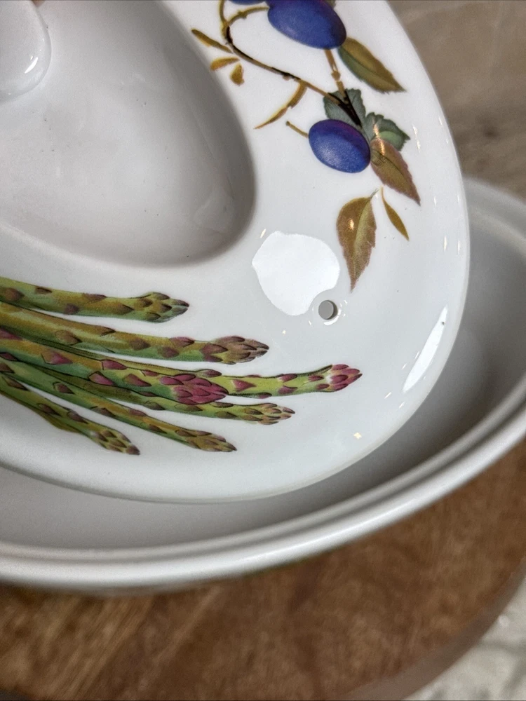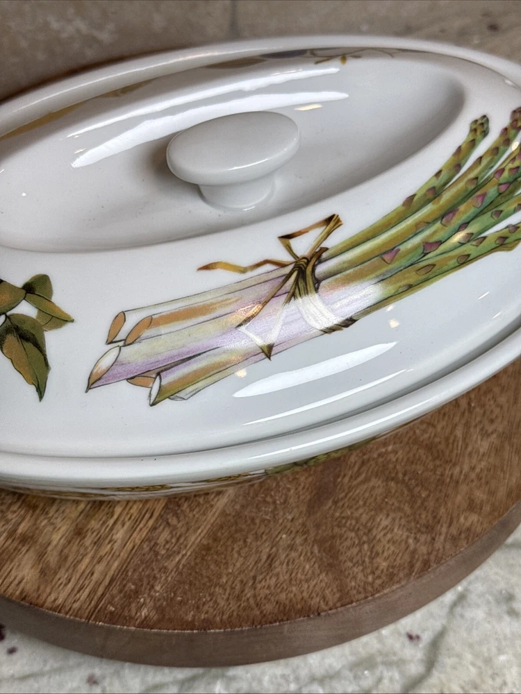 This is a gorgeous covered vegetable dish. There is a little smudging in the foot, that's about it - see photos. The sides of the dish have berries and shocks of wheat. The lid is covered with beautiful renderings of fruit. Bountiful harvest. • Length: 9 3/8 in • Height: 2 1/8 in • Special Characteristics: GLD HDLS • Porcelain • Crafted in England