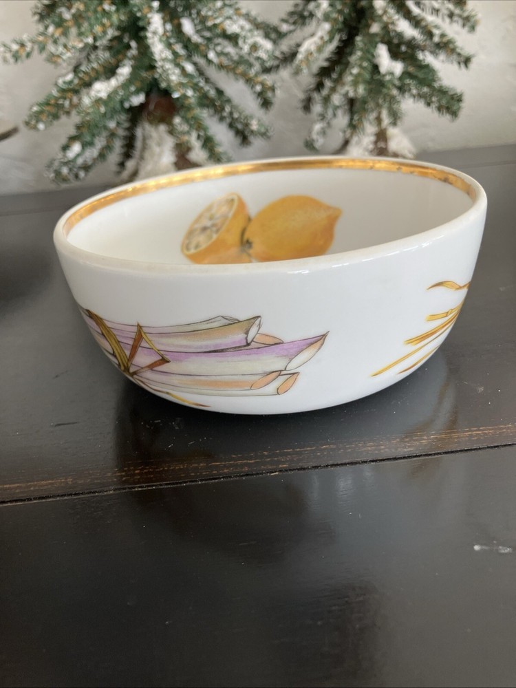 Add a touch of vintage charm to your breakfast table with this elegant Royal Worcester Evesham Gold cereal bowl. The bowl features a beautiful gold pattern with corn, lemon, berries, and asparagus motifs that give it a classic look. Made of high-quality porcelain, this round bowl is oven safe and perfect for all occasions. The bowl measures 5.25 inches in diameter and 2.25 inches in height, making it an ideal size for your favorite cereal or salad. This original piece was made in the United Kingdom in the mid-20th century and features a printed backstamp. It's a great addition to your Royal Worcester Evesham collection or as a standalone piece.