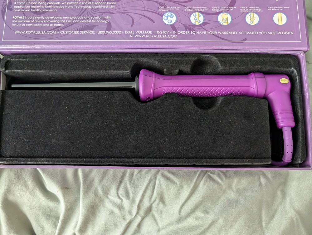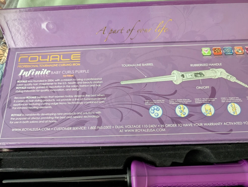 The Royale Infinite Baby Curls 18/9mm Curling Iron is a professional-grade styling device designed for all hair types. With a cool tip feature and powered by 35W, this electric curling iron from the Royale brand ensures safe and stylish results. The purple color and tourmaline heating plate material add a touch of luxury to your hair care routine.
