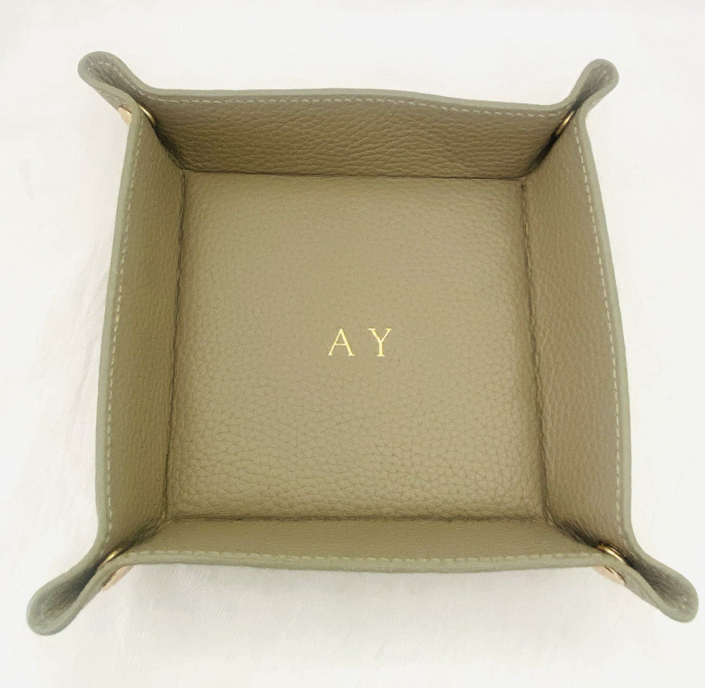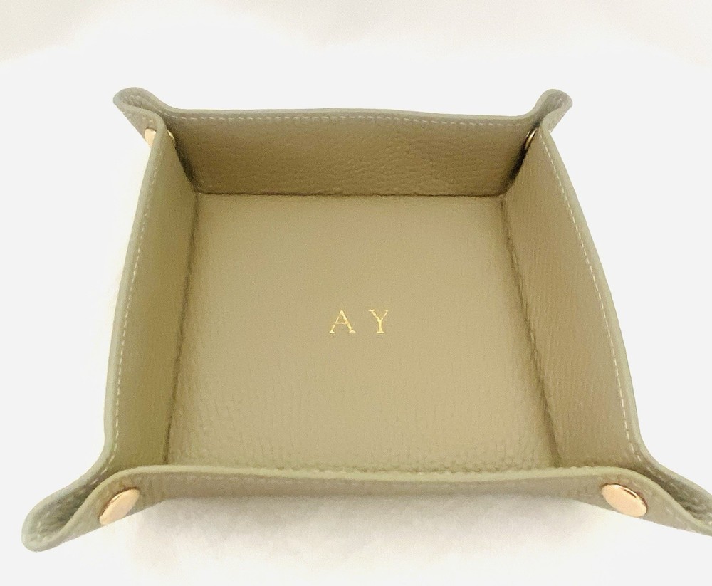Royce Leather Signature Valet Tray Taupe Jewelry with AY Monogram. Snaps on each corner which allows to lay flat. Top Nappa Leather. Measures 6x6x1.5". The Royce Leather Signature Catchall Tray in beige is a square-shaped jewelry organizer made of leather, featuring a personalized AY monogram. This tray is designed to hold necklaces, bracelets, rings, and earrings, making it a stylish and practical way to store and display your favorite accessories. Made in New York by Royce , this valet organizer is suitable for both men and women and adds a touch of sophistication to any vanity or dresser or great for travel. Catchall Valet Tray Keep your everyday essentials organized with our catchall valet tray, a timeless blend of function and craftsmanship. Made from premium full-grain leather, this elegant tray is designed to hold keys, wallets, watches, and other small items, keeping your space clutter-free. Hand-stitched and finished with precision, the valet tray features a structured yet flexible design with snap-button corners for easy assembly and storage. Whether placed on a nightstand, desk, or entryway table, it adds a touch of sophistication to any space while ensuring your essentials are always within reach. Perfect for home or office use, this handcrafted leather tray makes an excellent gift for those who appreciate quality and organization.