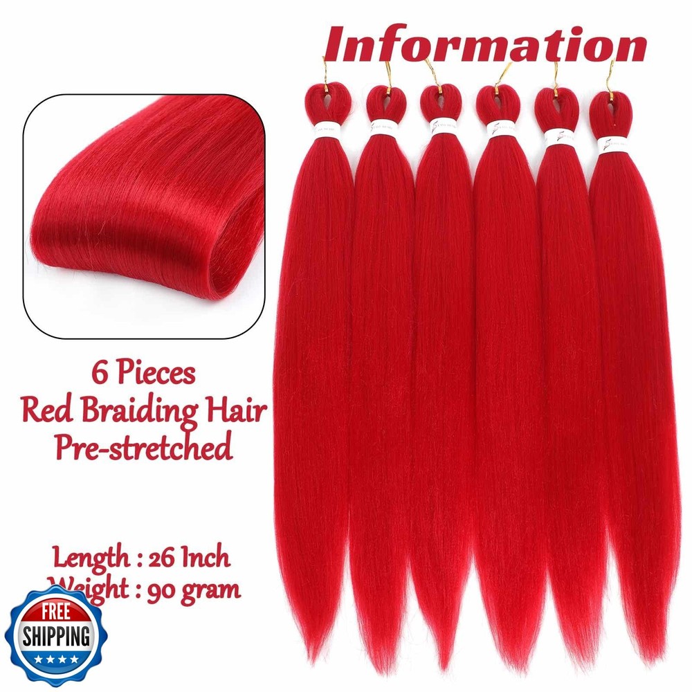 Royota Red Braiding Hair Pre Stretched Easy Hair Extension Yaki Synthetic Prestretched Soft Knotless Hair Box Crochet Twist Braiding (6pcs,Red,26inch) Features 【Hair Material】100% red Pre stretched braiding hair made with high quality Low Temperature synthetic fiber, creat a natural look. Super Soft and Skin Friendly, Feel Like Real Human Hair. 【Hair Quality】It's easily to change the braiding hair style in 75℃/85℃ hot water, you will get box braids, crochet hair, senefalese twist crochet etc.It's also easy to install and could be used as straight hair directly. 【Hair Details】For our prestretched braiding hair, folded length 26inch(equals to about 66cm),52inch when unfolded, about 90 gram/pack, 3packs/lot with free needle hook, usually 5-7 packs are enough for a full head. 【Suitable Occasion】This Easy braiding hair can make Box Braids, Crochet Braiding Hair, Senegalese Twist crochet, buns or ponytails you like, perfect for twists, braids and locs. 【Useage】Fits perfectly for Different Occasions, for Daily Use, Party, Date, Wedding, Festivals, Performance, etc. Shipping Free & Fast Shipping: We offer free shipping to most of the USA with a normal delivery time of 3-7 days. However, due to the current situation, additional delivery time (up to 3 weeks) may be required for some items. Alternative Carriers: We may use alternative carriers (e.g., USPS, FedEx, UPS) to ensure your package arrives safely and on time. Due to the use of multiple carriers, we are unable to provide a tracking number automatically. Handling Time: Orders are processed and shipped within 1-2 business days of receiving cleared payment. Shipping Restrictions: Shipping to Alaska, Hawaii, Puerto Rico, Guam, and other US territories may incur shipping charges or delivery restrictions. Please contact us before ordering, or your order can be refunded/cancelled. State Restrictions: Certain items may not be shipped to California due to state regulations. Contact for Tracking Updates: If you require tracking updates or have any concerns about the delivery of your order, please feel free to contact us, and we will be happy to assist you. Return Policy 30-Day Hassle-Free Returns: If you are not completely satisfied with your purchase, you can return the item for free within 30 days of receiving it for a full refund or exchange. Easy Return Process: Contact us, and we will provide you with a prepaid return shipping label and detailed instructions. No Restocking Fee: There are no restocking fees for returns. However, the buyer is responsible for return shipping costs if the return is not due to a seller"s error. Refund Processing: Refunds will be processed within 1 business day of receiving the returned item in its original condition. Feedback Your feedback is extremely important to us. We strive to provide the best products and customer service possible. If you are satisfied with your purchase, please take a moment to leave us a positive review. If you have any concerns or issues with your order, please contact us before leaving negative feedback. We are committed to resolving any problems and ensuring your satisfaction. Contact Us If you have any questions or concerns, please feel free to reach out to our customer support team. You can contact us through the eBay messaging system. We are available Monday to Friday, 9:00 am to 5:00 pm EST, and we will do our best to respond to your inquiry within 24 hours. Thank you for supporting our small family business!