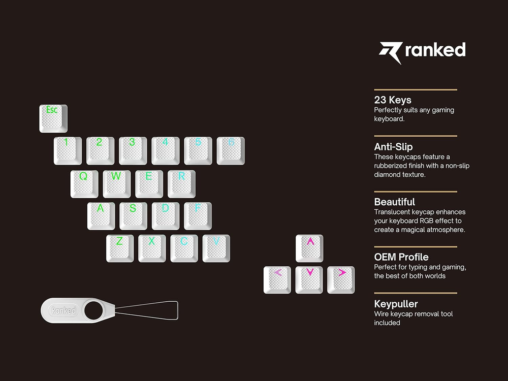 Store New Arrivals Add to Favorite View Feedback Contact Rubber Keycap Set | Double Shot Translucent | OEM Profile for Mechanical Gaming Keyboard (White, 23 Keys) Description Item model number TPR Rubber Keycaps Color White Product Dimensions 1.1 x 1.1 x 1.1 inches Material Rubber, Acrylonitrile Butadiene Styrene (ABS) Country of Origin China Compatible Devices Keyboard Item Weight 2.12 ounces Is Discontinued By Manufacturer No Size 23 Keys ⏩ 【23 Keys Set】Contains the following keys: ESC , 1 -6 numbers , Q W E R , A S D F , Z X C V as well as the 4 arrow keys. ⏩ 【Anti-Slip Texture】These doubleshot shine-through keycaps feature a rubberized finish with a non-slip diamond texture. Great for gamers and those who want some extra grip on their most-used keys. ⏩ 【Wide Compatibility】OEM Profile, Compatible with Cherry MX , Gateron, Kailh, Kailh Box, Outemu TTC & LK Mechanical Key Switches Perfectly suit your 60 / 65 / TKL or Full Size Gaming Keyboard. ⏩ 【True Doubleshot 】 The newest Doubleshot technique makes those translucent rubber keycaps more durable while being grippy. ⏩ 【Performance】Increase your gaming performance by giving you for grip during your games. Ideal to play in any given situation. Widely used by pro players. ⏩ Wire Keypuller also included to change your key caps on the go or at a esport tournament. ⏩ Compatible with both ANSI US - American Layout and ISO European layouts. Not compatible with Low Profile switches. Product Description Technical Specifications Layout ANSI US / ISO ( Universal) Numbers of keys 23 Keys Key caps material TPR + ABS Key caps printing Double Shot Profile OEM Thickness 1.4mm Translucent Yes Keypuller Included Yes RUBBERIZED DOUBLE SHOT KEYCAPS 23 keys of pure grip. Never miss a move again - experience total control without compromising comfort! Non-slip diamond texture to provide extra grip on the most commonly used gaming keys. Ranked rubberized keycaps are created using refined industry-leading practices, resulting in a highly premium feeling. Specifications: Material: TPR + ABS Key Profile: OEM Compatible with: Cherry MX, Gateron, Kailh, Kailh Box, Outemu, Lekker switches. ( Not compatible with Low Profile Key Switches) 23 keys: [ESC] 1 , 2 , 3 , 4 , 5 , 6 Q , W , E , R A , S , D , F Z , X , C , V Arrow keys ( x4) ABOUT US We offer the best prices around on high quality products. Our E-store includes media such as books, movies, music and games while offering electronics, toys, sporting apparel, clothing, tools, general home, garden items and more. SHIPPING We are always working hard to ensure your package arrives as soon as possible. Please understand that some factors like weather, high postal traffic, and the performance of shipping companies are outside of our control. We offer free shipping to the lower 48 states and ship within 2 business days of payment, usually sooner. We do not accept P.O. Boxes. Please provide a physical address. For shipping outside of the continental USA, we only use eBay's Global Shipping Program.The item is shipped to KY and then sent to the rest of the world. International customers are responsible for all duties and taxes. Continue to check out in order to calculate costs for shipping the item to your country. Messages regarding eBay's Global Shipping Program MUST be directed at eBay EXCLUSIVELY. RETURNS We offer a 30-Day Return Policy on items which you are not completely satisfied with. You have the option for a full-refund or an exchange of the item. No returns are available on items shipped outside of the USA. PAYMENT We accept PayPal. CONTACT US This page content is yet to come Please ad us to your favorite seller and visit again later Thank You CUSTOMER SATISFACTION We try our very best to make sure every customer is completely satisfied. If there's a problem, message us! We're happy to help. WE ACCEPT Copyright © 2021 AutoDS. | All Rights Reserved
