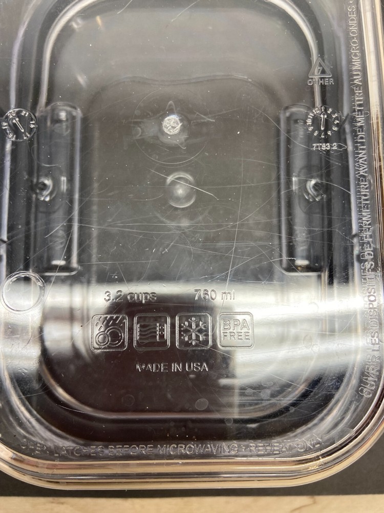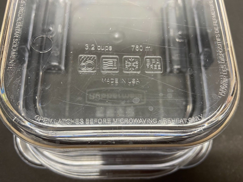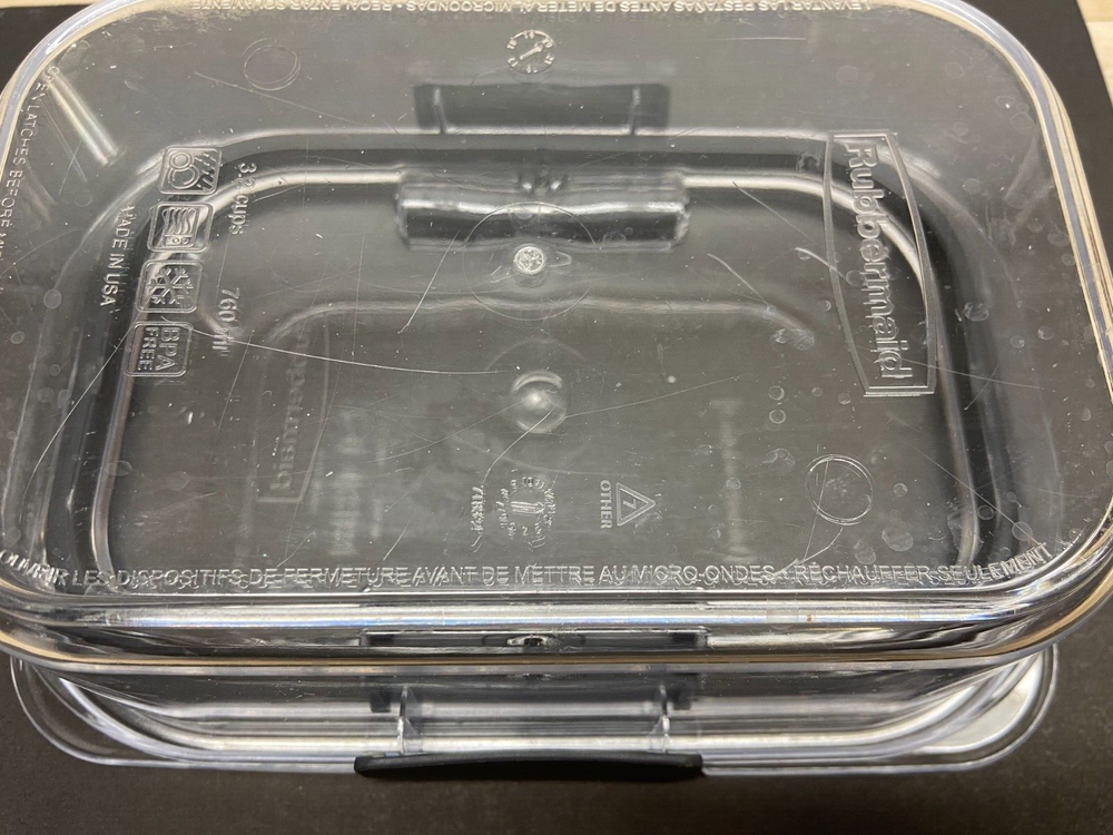 Rubbermaid Brilliance Food Storage Container 3,2 Cups 760ml Clear Plastic.They all have some minor scratches but overall in very good condition.The lid closes very tight