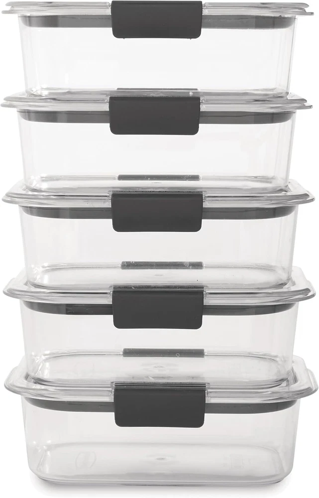 Rubbermaid Brilliance Food Storage Containers, BPA Free, Set of 5 (3.2 Cup) Product Details Recommended Uses For Product: Meal Prep Special Feature: Airtight, Leak Resistant Container Shape: Rectangular Closure Type: Clip-On Is Dishwasher Safe: Yes Material Type Free: BPA Free Item Package Quantity: 1 Item Weight: 0.01 Ounces Product Care Instructions: Dishwasher Safe Item Volume: 3.2 Cups Unit Count: 5.0 Count Is Microwaveable: Yes Manufacturer: Rubbermaid UPC: 05 Part Number: 2041405 Item Weight: 0.01 ounces Product Dimensions: 10.2 x 8.19 x 5.67 inches Country of Origin: USA Item model number: 2053295 Is Discontinued By Manufacturer: No Size: Set of 5 (3.2 Cup) Style: Set of 5 (3.2 Cup) Containers Pattern: Container Shape: Rectangular Number Of Pieces: 5 Special Features: Airtight, Leak Resistant Batteries Included?: No Batteries Required?: No Number of Sets: 5 Brand: Rubbermaid Material: Plastic Material Feature: BPA Free Capacity: 757 Milliliters Product Dimensions: 10.2"L x 8.19"W x 5.67"H Crystal-clear Tritan Built: Stain-resistant and odor-resistant material for a clear view of contents Lightweight & Sturdy: Easy to carry, yet durable for everyday use Built-in Vents: Convenient microwave heating without removing the lid Space-saving: Stackable design for organized fridge or pantry Dishwasher, Microwave & Freezer Safe: Easy and safe to use in various conditions Large Set: Includes five 3.2-cup containers and matching lids, totaling 10 pieces Revolutionize your meal prep with the Rubbermaid Brilliance Food Storage Containers set. Made from BPA-free Tritan, these high-quality containers are visibly clear like glass, but are incredibly durable and easy to carry. They feature 100% leak-proof seals and secure latches to preserve freshness and prevent spills. Not only are they stain and odor-resistant, but they also have built-in vents under latches for mess-free microwaving with the lid on. With a stackable design, they ensure space-efficiency in your fridge or pantry, improving organization and accessibility. This pack comes with five 3.2-cup plastic containers and matching lids.