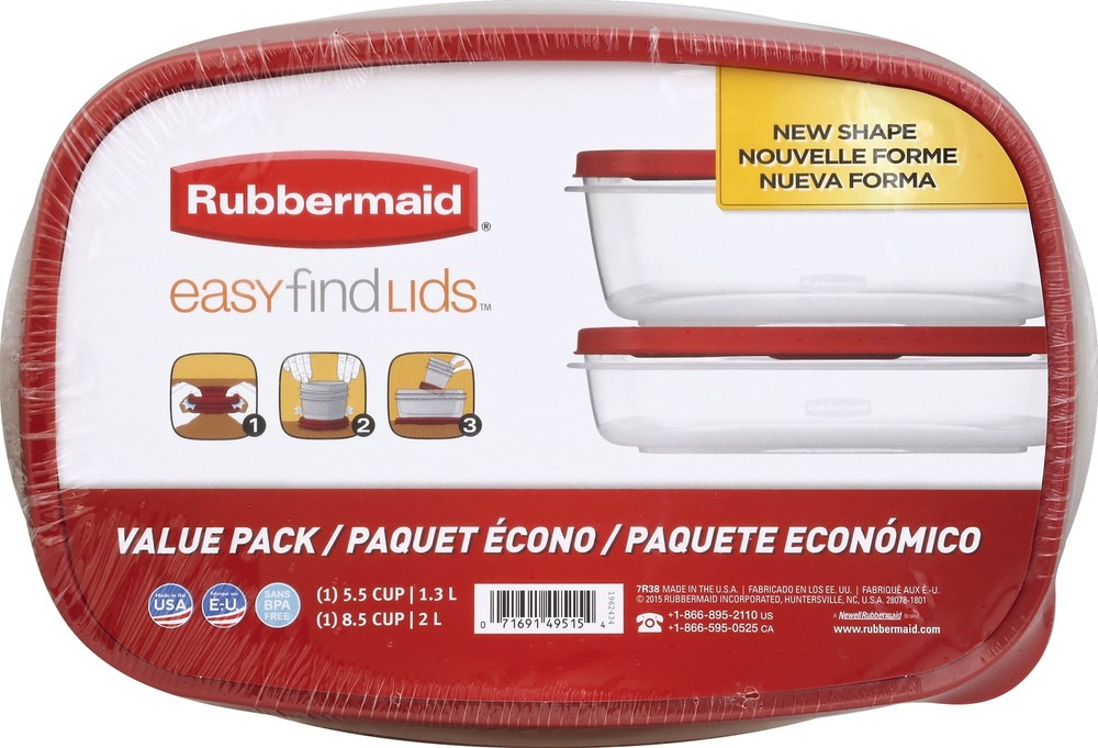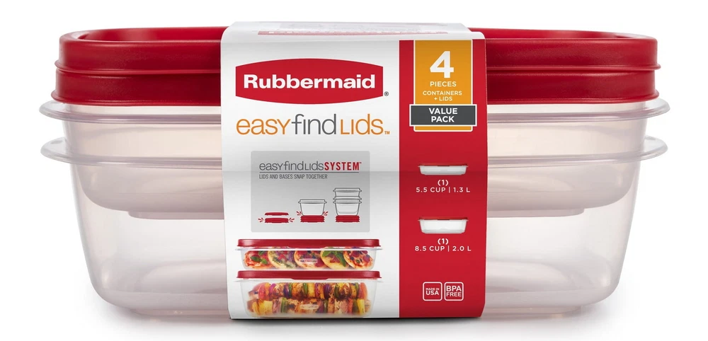 Find the right lid, right now! This food storage container features the Rubbermaid Easy Find Lid system: the lid snaps on to the container base as well as other same-size lids, so that the right lid is always at your fingertips. This square container nests easily with others to give you more space in the fridge or cupboard. Rubbermaid EasyFindLids Food Storage Container Value Pack with Lids, 1-8.5 (2.0 Liter) Cup, 1-5.5 Cup (1.3 Liter) Rubbermaid EasyFindLids Food Storage Container Value Pack with Lids, 1-8.5 (2.0 Liter) Cup, 1-5.5 Cup (1.3 Liter) Food storage container features an Easy Find Lid that snaps on to the container base as well as same-size lids, so you can always find lids when you need them, and your cabinets stay organized Plastic food storage container is great for leftovers, cabinet storage, crafts, and more Nests easily with other containers for compact storage Thick, durable container walls for everyday use Microwave-safe base, freezer and dishwasher safe, and BPA free Stackable square-shaped 14-cup food-storage container Super-clear base allows for better visibility of inside contents Lid fits multiple-size bases; space-efficient design for storing Safe to use in refrigerator, freezer, microwave, and dishwasher