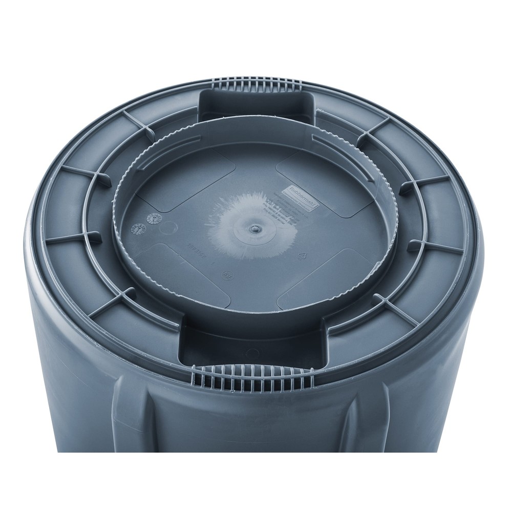 This gray 32 gallon container without lid features the renowned durability of the BRUTE™ line with all‐plastic professional‐grade construction that will not rust chip peel and resists dents. It has reinforced rims for added strength built‐in handles that make carrying easy and prevent jamming when nesting and a double‐ribbed base that increases stability and dragging capacity. No container is more versatile. Model #: 2632 Professional‐Strength Construction Seamless Design Innovative Venting Channels Make Lifting Liners up to 50% Easier Integrated Cinches Secure the Liner All‐Plastic Construction Will Not Rust Chip or Peel Dent‐Resistant Reinforced Rims and Base Molded‐In Handles Double Ribbed Base UV Resistant Stackable Assists In Complying with HACCP Guidelines Guaranteed to Never Fade Warp Crack or Crush Use with FG263100 lid * Large item may incur additional shipping charges
