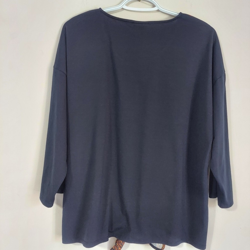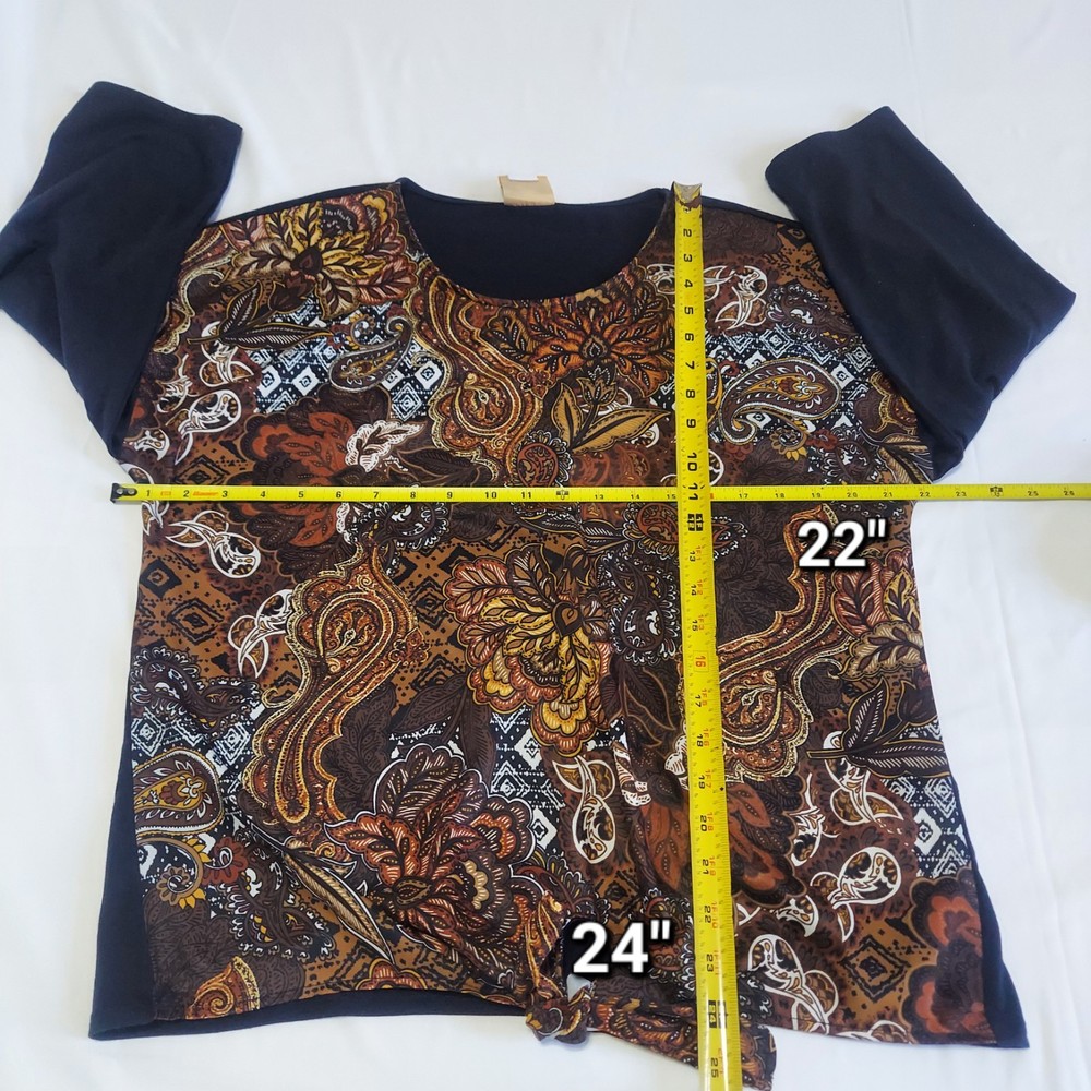 The Ruby Rd Women's Paisley 3/4 Sleeve Top in size Small features a tie hem detail, making it a stylish and versatile addition to any wardrobe. Made of lightweight polyester material, this multicolor blouse is perfect for travel and casual occasions. With a regular fit and round neckline, it offers comfort and easy wearability. The casual sleeve style and pullover closure add to its convenience, while the brand's reputation for quality ensures a durable and fashionable piece. Machine washable for easy care. This top is a chic choice for any woman looking for a trendy and comfortable option. Please check the photo for measurements