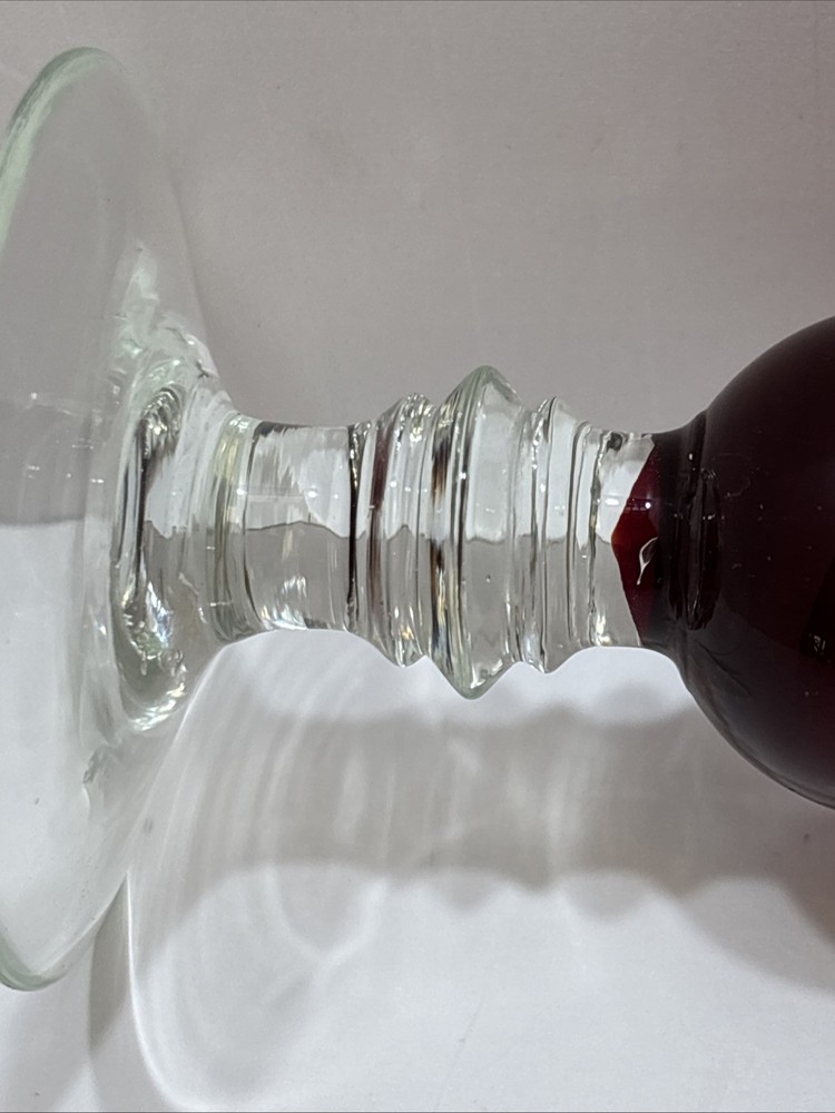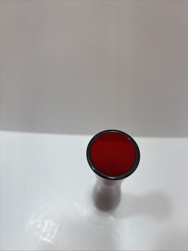 This Ruby Red 8” Bud Vase with a Clear Crystal Base is a beautiful and unique decorative piece. The vase is hand-blown glass with a ruby red color and a clear crystal base, adding an elegant touch to any space. It is signed by the maker and is in excellent condition with no chips or cracks. The intricate production style and technique make this vase a standout piece in any collection, and its handmade nature adds to its charm and character.