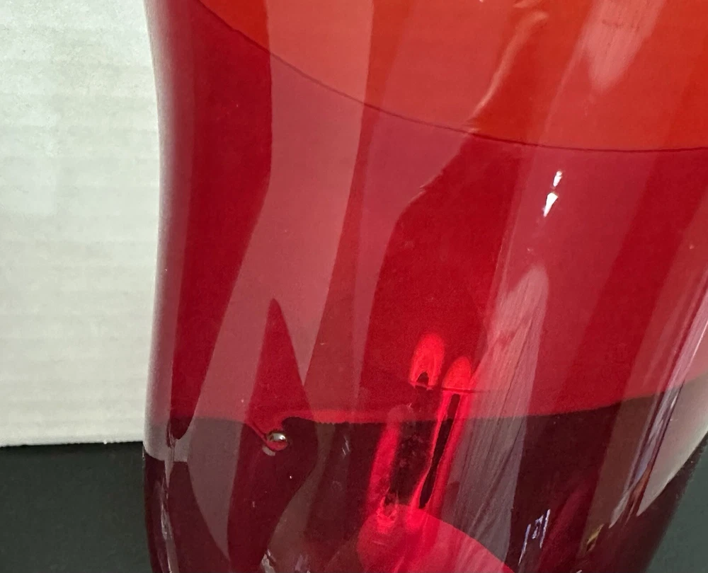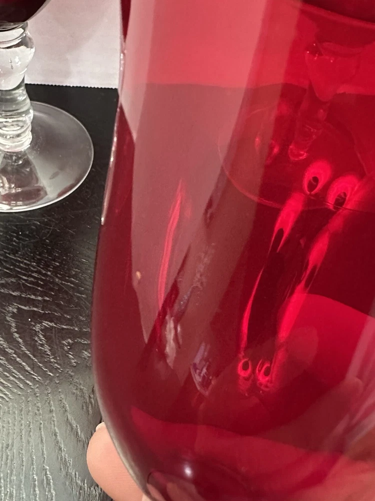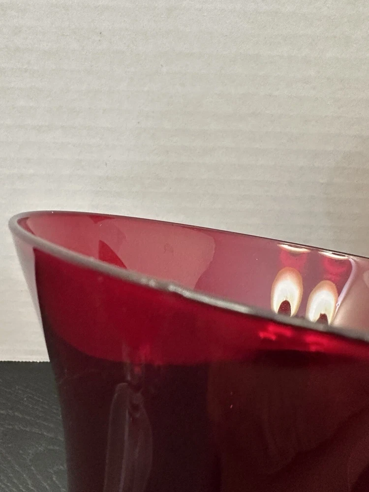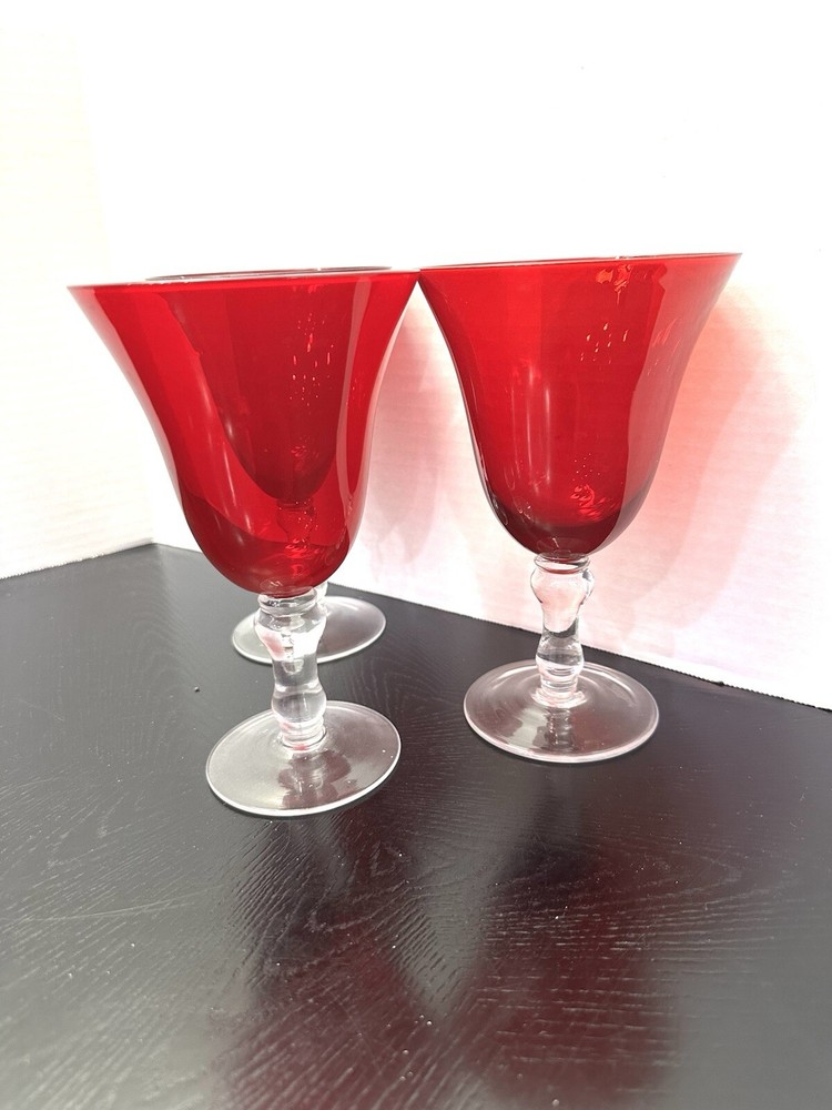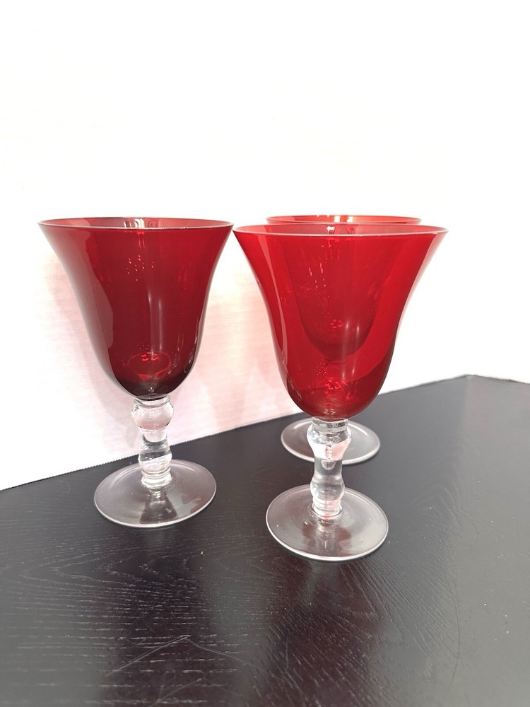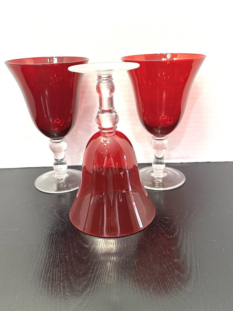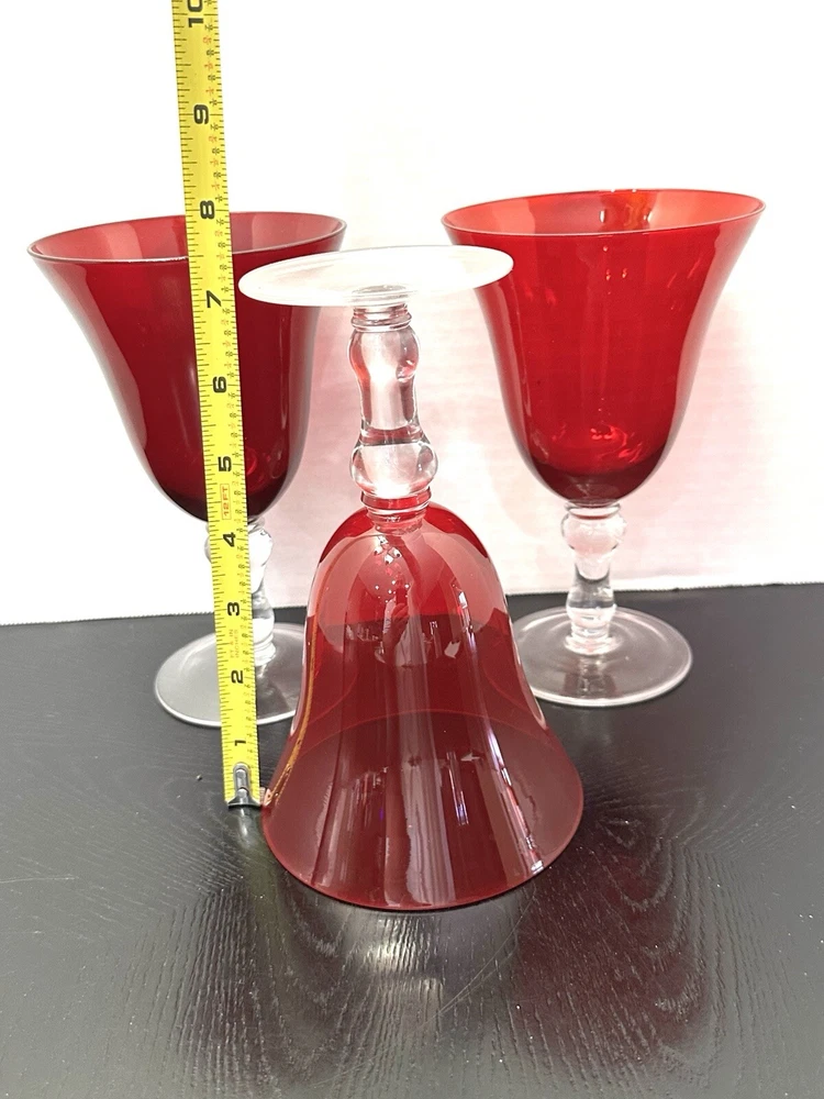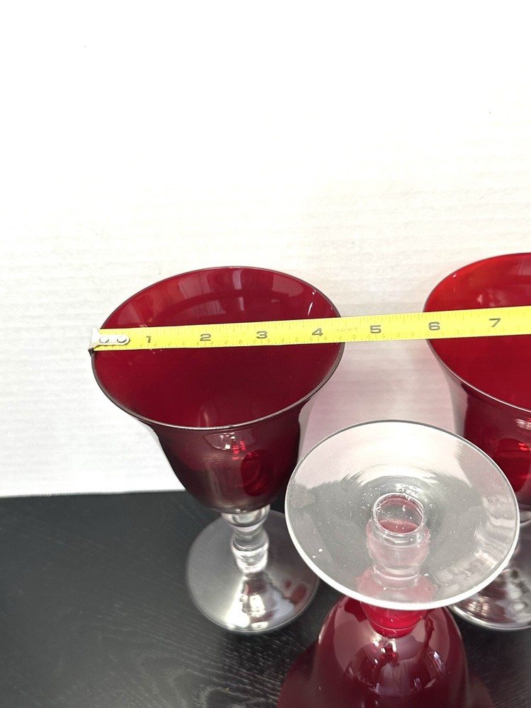 VTG Ruby Red Bell Shaped Wine/Water Goblets Set Of 3 Clear Steam Flare Bowl These are beautiful Each glass has a small imperfection. One is in the glass on rim, other two have small dings on the side. Looks like one has a hairline through the glass but you can’t feel it in the glass. Pictures of this are included