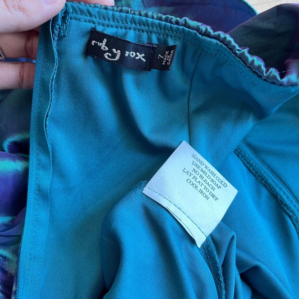 Y2K Iridescent Dress Description: absolutely stunning, vintage Y2K, teal and purple iridescent strapless floral embroidered detail tie waste mini dress by Ruby Rox in US Junior size 7. self is 60% polyester and 40% nylon, and lining is 100% polyester. Condition: fair condition overall. No visible signs of wear, but unfortunately the zipper is broken and needs to be replaced. It is finicky, and will zip properly sometimes, but will not zip properly other times. Price has been adjusted to reflect this flaw. Lay flat measurements: - pit to pit: 15 inches - waist: 14 inches - hips: 23 inches - neckline to hem: 27.5 inches - waist to hem: 18 inches Mannequin measurements: - bust: 32 inches - hips: 24.5 inches - waist: 34 inches #Y2K #Vintage #IridescentDress #Glam #PartyDress