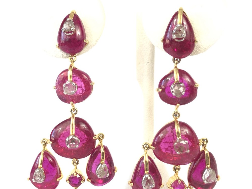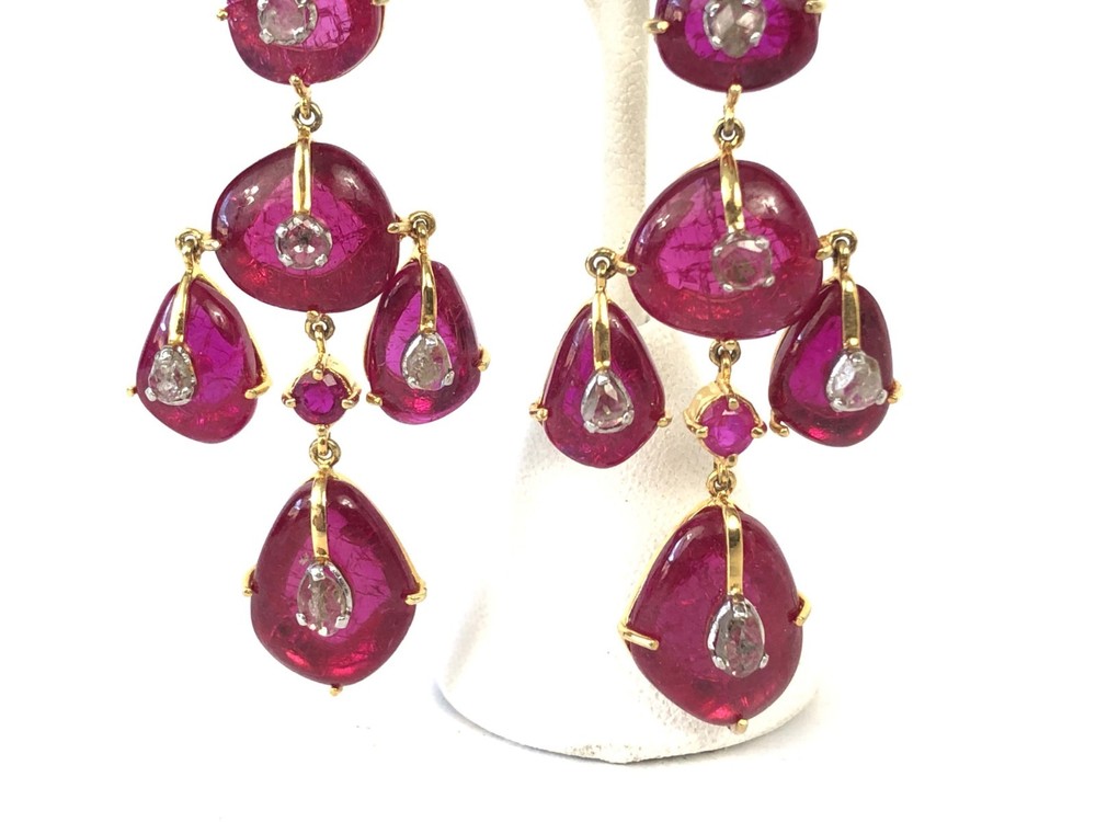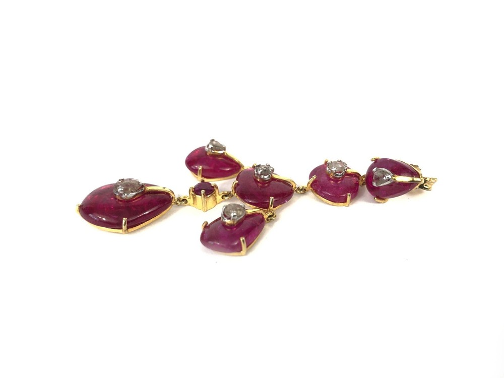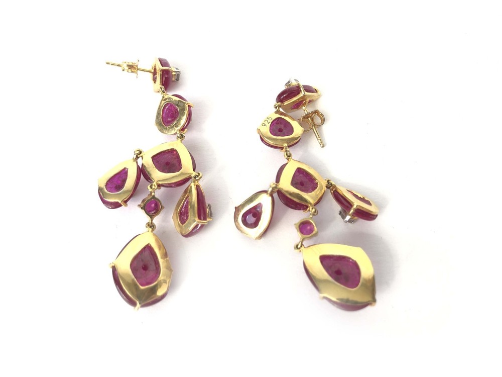 Natural Ruby Rose Cut Diamond Kundan Dangle Drop Earrings Gold Plated 925 Sterling Silver I tend to describe the cut of these diamonds as polki cut with a rose cut top. That way one will understand what they don't typically see in the West. Polki diamonds have parallel top and bottom surfaces, fairly shallow, and make full use of a diamond, especially in the lower clarity grades. Polki diamonds, with their emphasis on the natural shape and less emphasis on clarity, allow for a unique, rustic aesthetic and are often more affordable than highly graded, faceted diamonds.Everything about a polki diamond is completely natural. Type: Post Earrings Length: 2.75" Width: 1" Signed: 925 Weight: 20.8 gr Condition: Pre-Owned scattered light scratch, nothing serious, stones are fine with no damage, clasps are secure. You will see quite a few inclusions that can reach the surface on both the diamonds and rubies. They are not damaged in other words. Comments: This is a stunning pair of statement earrings. The stones are all well matched, and they have a very good weight. Please see all photos for details