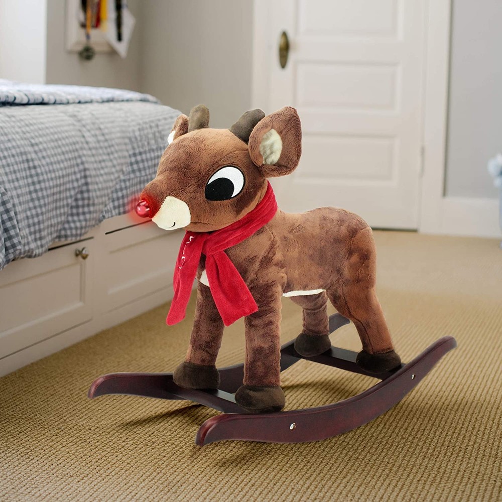 A HOLIDAY CLASSIC: This soft rocker is based on the iconic red-nosed reindeer we all know and love! Our Rudolph character rocker is sure to bring joy to kids 2 to 5 years old. BE IMAGINATIVE: Ride away to adventure with this lovable reindeer who has brought joy to both littles and adults of all ages for over 50 years! MUSICAL & BRIGHT: Rudolph character rocker plays the well-known Rudolph The Red-Nosed Reindeer song and his nose lights up, shining bright for all to see! SPOT CLEAN: Damp cloth allows for a quick surface wash. FULLY ASSEMBLED & BATTERIES INCLUDED: Rocker arrives complete and ready to play!