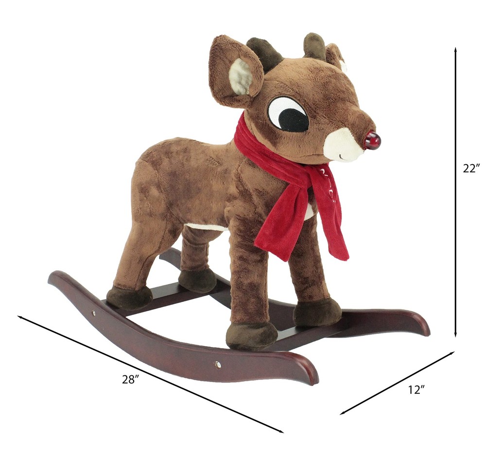 A HOLIDAY CLASSIC: This soft rocker is based on the iconic red-nosed reindeer we all know and love! Our Rudolph character rocker is sure to bring joy to kids 2 to 5 years old. BE IMAGINATIVE: Ride away to adventure with this lovable reindeer who has brought joy to both littles and adults of all ages for over 50 years! MUSICAL & BRIGHT: Rudolph character rocker plays the well-known Rudolph The Red-Nosed Reindeer song and his nose lights up, shining bright for all to see! SPOT CLEAN: Damp cloth allows for a quick surface wash. FULLY ASSEMBLED & BATTERIES INCLUDED: Rocker arrives complete and ready to play!