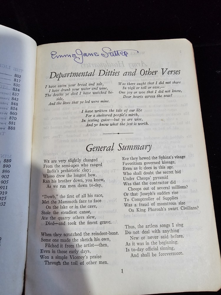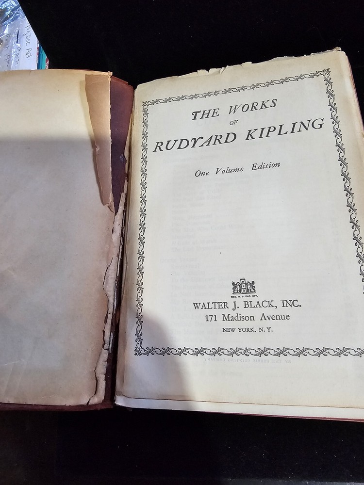 The product is an antique one-volume edition poetry book by Rudyard Kipling, bound in leather. The book is written in English and features poetry as its main topic. It is an original piece, not a facsimile, and is not signed by the author. It has the first page loose and unbound, and one page with some writing on it as seen in pictures, the outside is in rough condition due to age and the inside is in good condition.