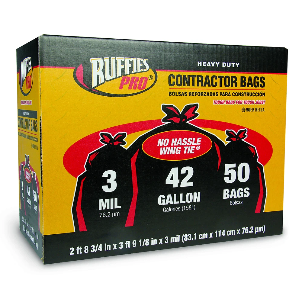 Ruffied Pro Contractor Trash Bags 42 Gallon Wing Tie 3 Mil thick heavy duty contractor clean up bag can be used for professional and residential applications. Tough clean up jobs need this tough clean up bag. Ruffies Pro, 42 Gallon Contractor Trash Bag Wing Tie 50 ct black, Capacity 42 Gal, Quantity 50, Closure Type Tie, Model# 1124905 Northern Tool Item# 5593474 Item Weight: 17.2500 lb(s) Manufacturer: MPN: Warranty: . Product Summary: Ruffied Pro Contractor Trash Bags 42 Gallon Wing Tie 3 Mil thick heavy duty contractor clean up bag can be used for professional and residential applications. Tough clean up jobs need this tough clean up bag. Payment Instructions You can pay us securely through eBay. All orders will contain an invoice/receipt. IMPORTANT: We will not honor requests to remove invoices or receipts from packages. No exceptions ON U.S. PURCHASES, Northern currently collects sales tax on purchases shipped to all states except: Alaska, Delaware, Montana, New Hampshire, Oregon Shipping Information This product will be shipped by Parcel. Parcel Shipping: Ground shipped items must be sent to a physical address and cannot be sent to a PO box. If a PO box address is submitted without a physical address, it may delay your order. We cannot ship to APO/FPO boxes. Please note that we do not ship items on weekends or holidays. More information on shipping and handling times can be found on our Store Policies Page . Customer Care We want you to be satisfied with your purchase; please notify us by email if you have any concerns. Before you send an email message, please check our Help Section . We may already have an answer to your question! We are available to answer your email questions Monday through Friday from 8am - 3pm CST, excluding holidays. If your email is sent on a weekend, holiday or after business hours, we will respond to you on the following business day. Returns may be accepted on most items within 30 days of receipt of the item. All returns require authorization from us. Some returns are charged a 15% restocking fee. Please click the Shipping and Payments tab on this item for specific return information and full details. About Our Products Product Warranty: Warranty information and contact details can be found on our Store Policies Page. We are working hard to ensure that the information provided on the eBay product advertisements is accurate and up-to-date. We reserve the right to correct ad errors and/or omissions. Pricing and availability is subject to change without notice. No
