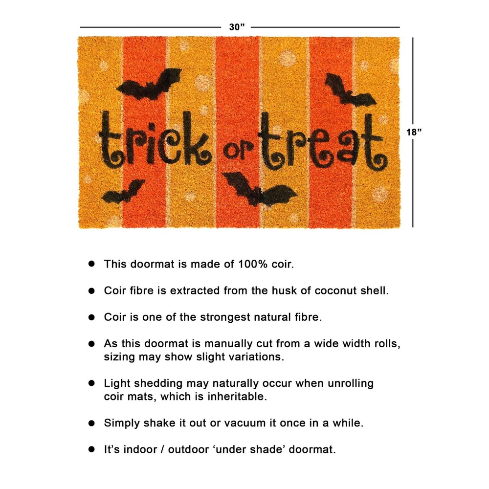 Make your home more inviting with our printed contemporary doormat. Crafted of coir, a fiber made from the husk of a coconut, this textural piece will keep the outdoors out and the indoors a little cleaner. Coir face with vinyl non-skid back. To clean simply sweep or shake. Made in India.Features: Recommended for Indoor or Outdoor Use Under ShadeSweep or Shake CleanMade from Coir, one of the strongest natural fibersPerfect for all entrywaysNon-Skid Backing Free Shipping Over $49.99* Details RugSmith Multi Machine Tufted Trick or Treat Doormat, 18" x 30" - 18" x 30" Product Description: Make your home more inviting with our printed contemporary doormat. Crafted of coir, a fiber made from the husk of a coconut, this textural piece will keep the outdoors out and the indoors a little cleaner. Coir face with vinyl non-skid back. To clean simply sweep or shake. Made in India. Features: Recommended for Indoor or Outdoor Use Under Shade Sweep or Shake Clean Made from Coir, one of the strongest natural fibers Perfect for all entryways Non-Skid Backing