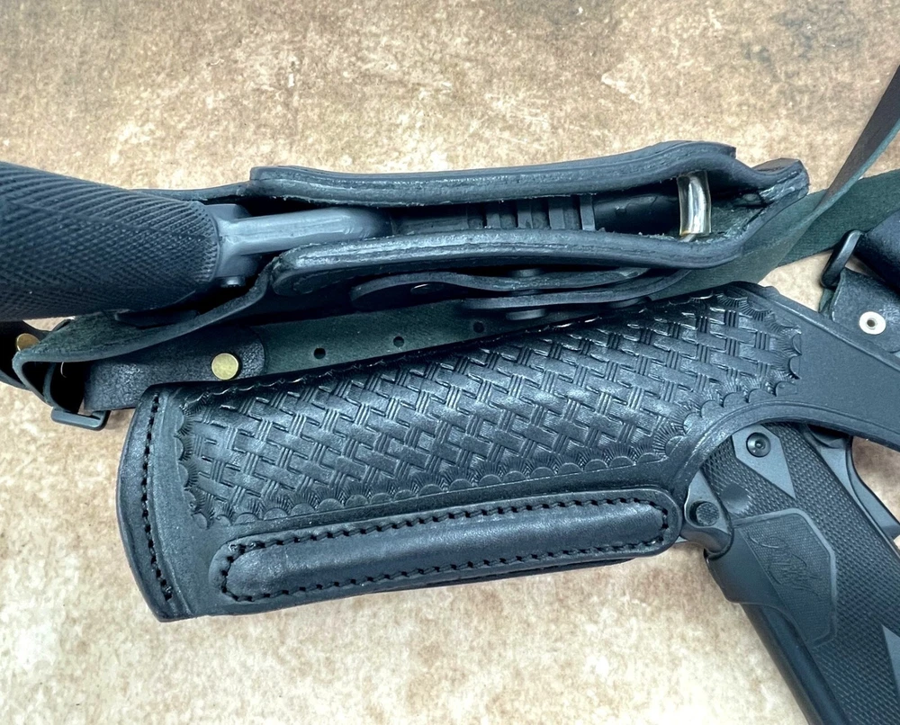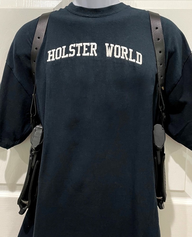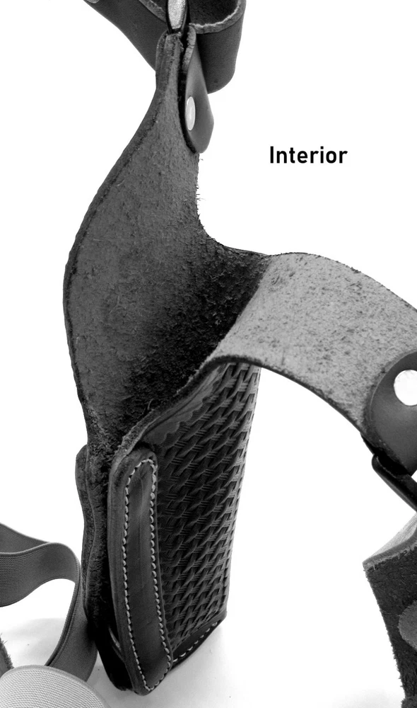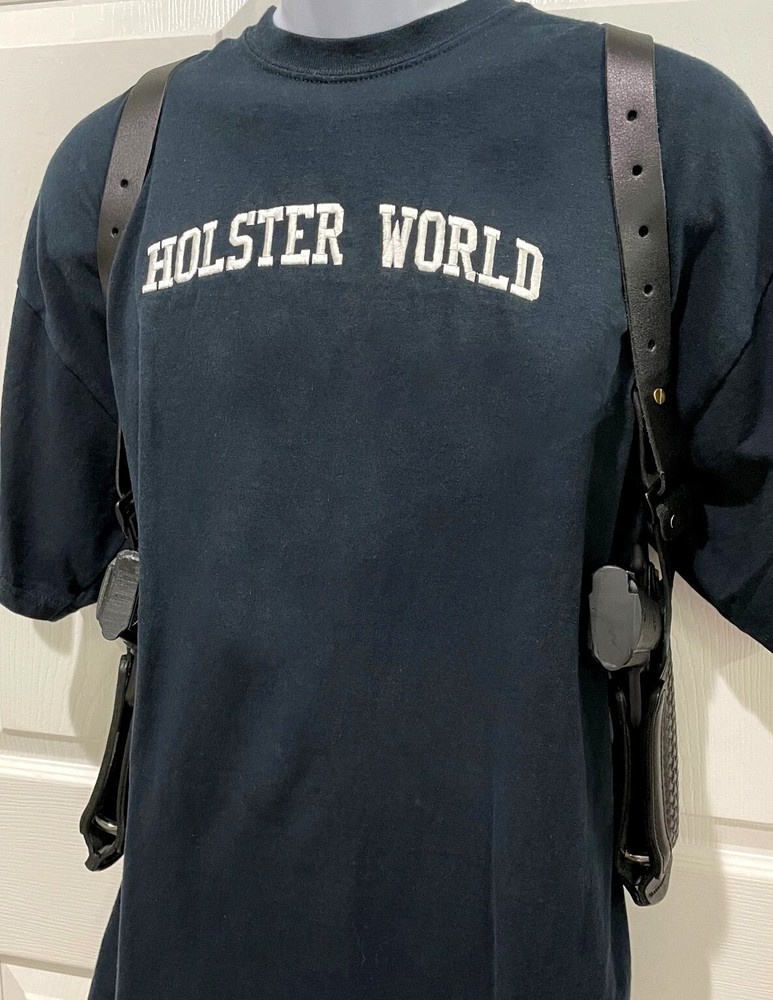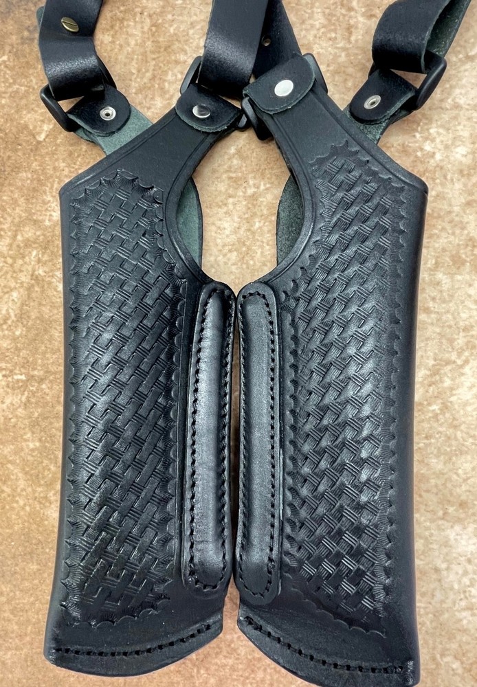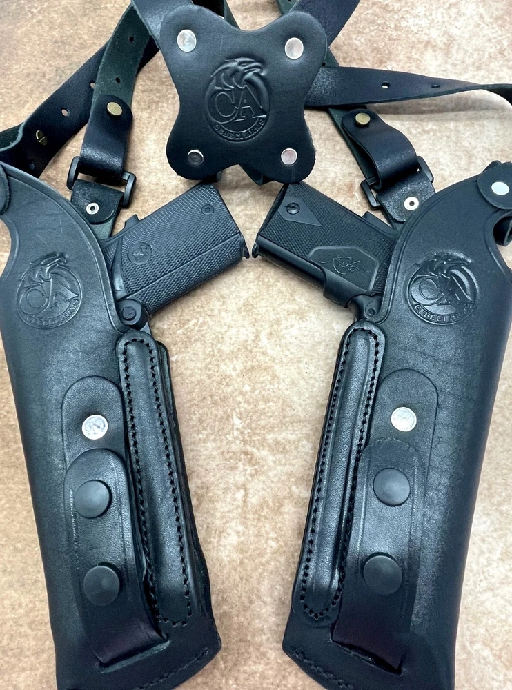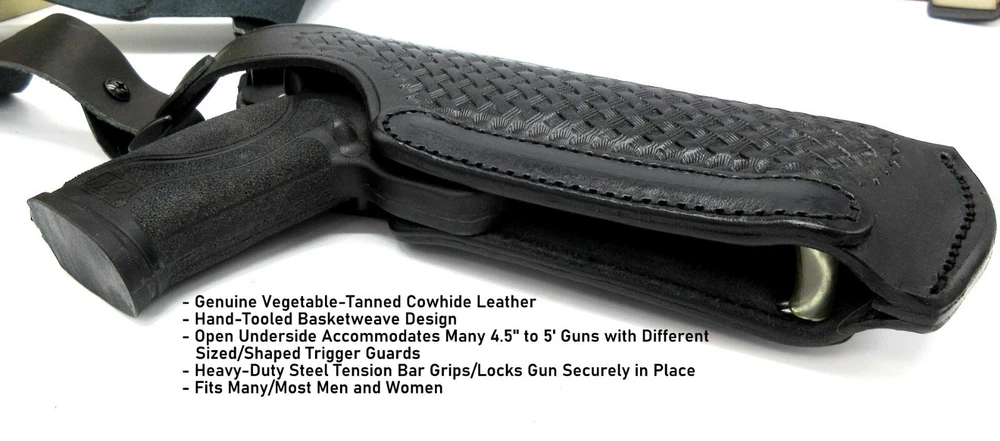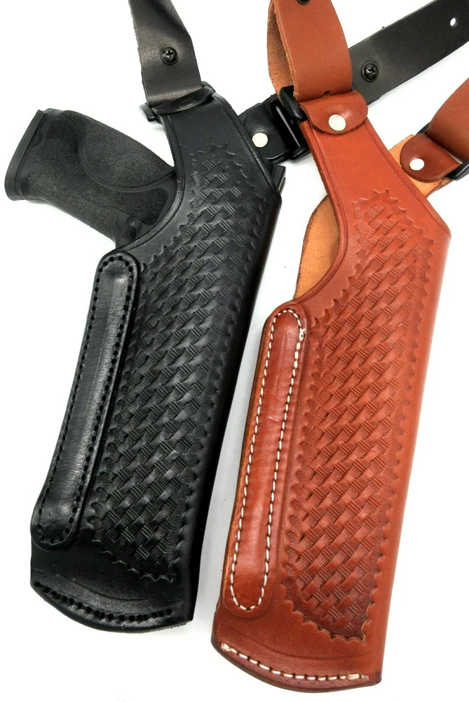 CEBECI ARMS VERTICAL DOUBLE SHOULDER HOLSTER MSRP: $197 Genuine Premium Vegetable-Tanned Leather Construction Hand-Tooling in Basketweave Design Heavy-Duty Steel Tension Bar Tightly Holds Gun in Place Open Belly/Underside Accommodates Multiple Guns with Different Sized/Shaped Trigger Guards Adjustable Leather Shoulder Harness with 2 Tie Downs Holsters Have Closed Bottoms Vertical Draw For Many Medium to Large-Framed Autos with 4.5" to 5" Barrels, such as Sig Sauer P220 P226, Glock 17 22 31 34, S&W M&P, Ruger SR45, CZ-75, Beretta 92FS, 1911, etc. Fits Many/Most Men and Women up to 4X Not Sure? Just Ask and We'll Confirm if Your Gun will Fit before Purchasing Cebeci Arms has been in business for over 30 years and is an experienced leather goods manufacturer specializing in handgun holsters, law enforcement & police equipment, rifle slings, rifle/shotgun cases, shotgun belts, casual belts, cowboy action shooting gear, and other shooting & tactical accessories, all available in premium leathers and Cordura nylon. Good to Know! Because Cebeci's leather is from range bred and grown hides, there may be natural range markings in the grain of the leather. This is normal for top grain steerhide and adds to the beauty, character, and uniqueness of your Cebeci Arms leather products. Benefits of Vegetable Tanning: Vegetable tanning uses only organic substances like live oak bark, beets, walnut shells, plant extracts or other vegetable matter containing tannins. These substances will not corrode the finish of your gun if left in the holster for an extended period of time like man-made chemicals can do. Benefits of Synthetic Thread: Synthetic thread is impervious to deterioration from the long-term effects of perspiration, sunlight, chemicals and moisture, and will not rot. It is far stronger and more resilient than cotton fibers. We Want You to LOVE Your Item! So try it on and see what you think. If you are not completely satisfied, return the item in its original condition for a full refund. Thank you!