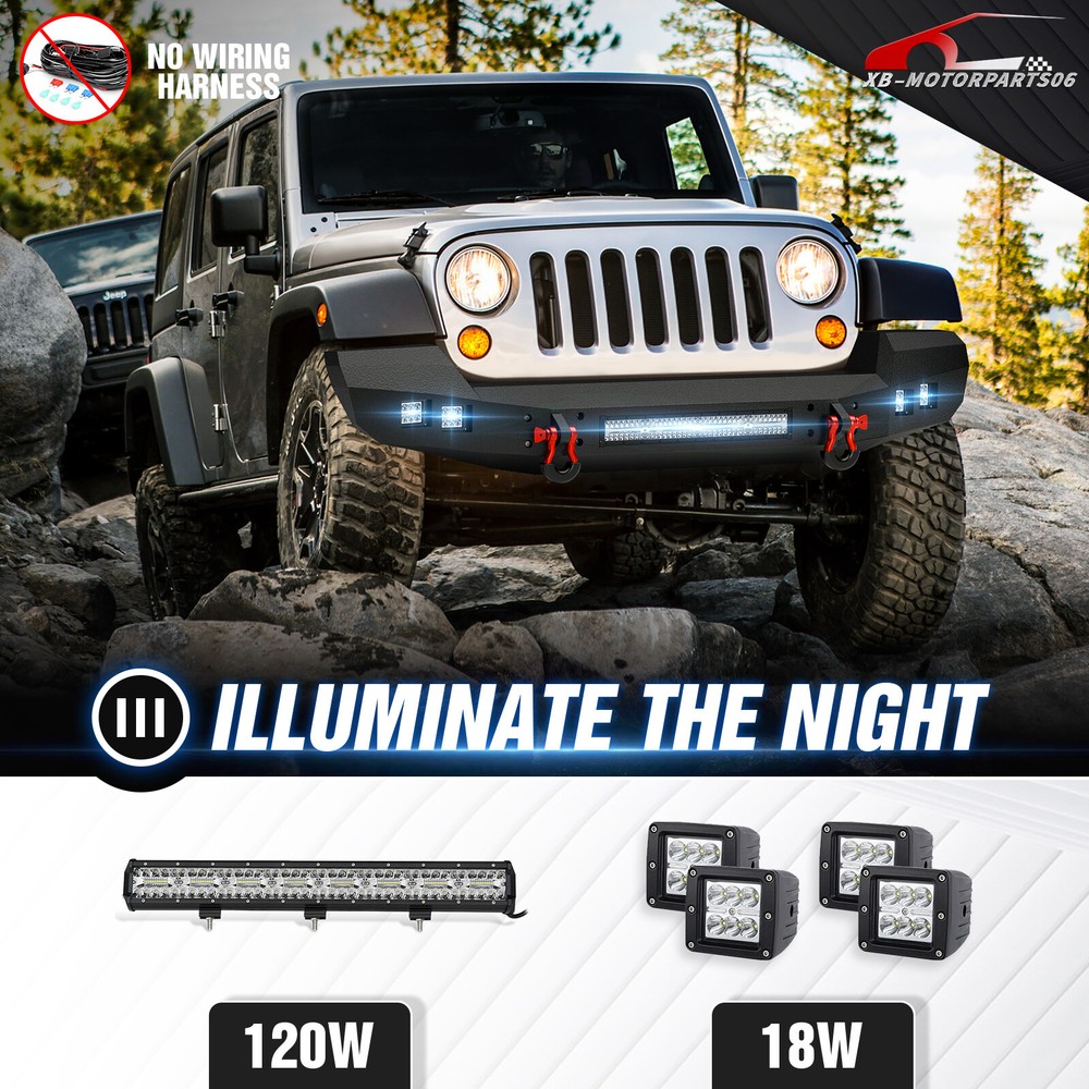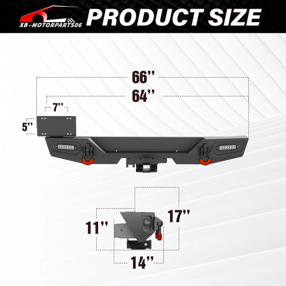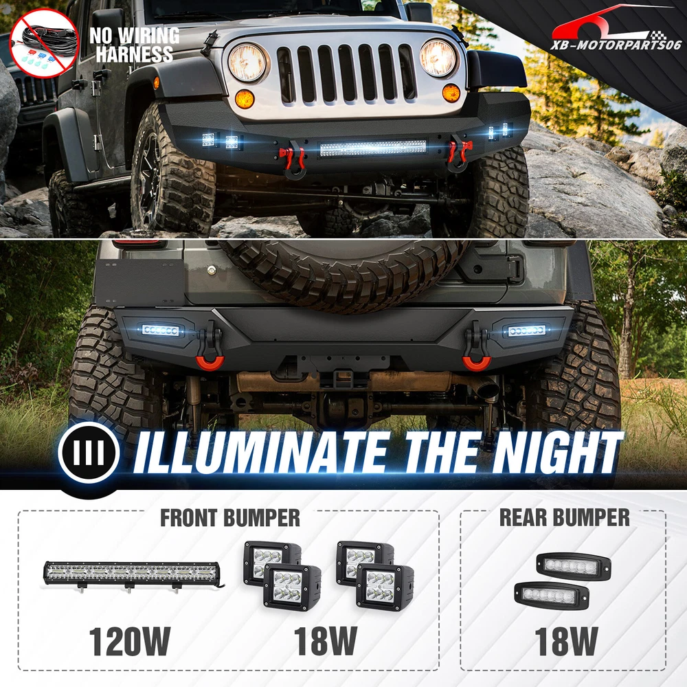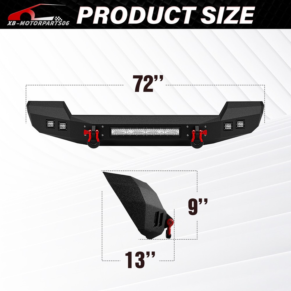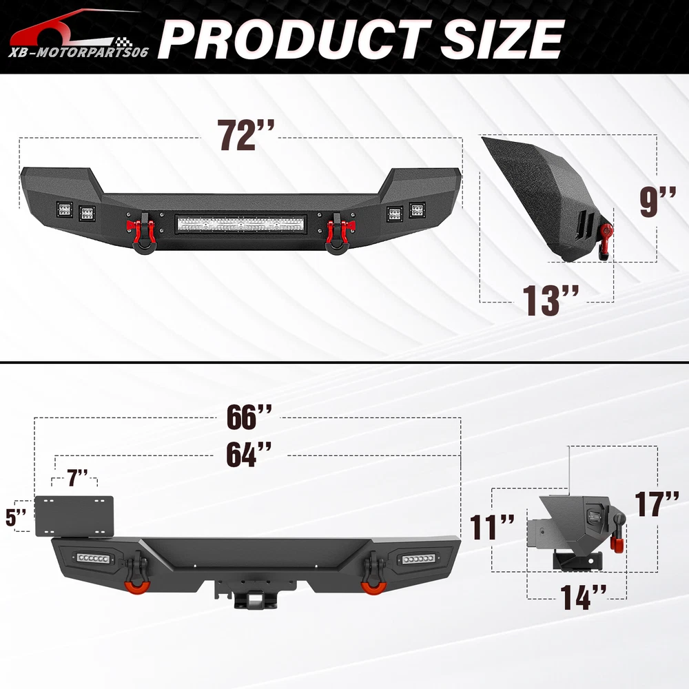 Front Or Rear Bumper With D-rings For 2018-2025 Jeep Wrangler JL JLU Unlimited Please pay attention to the product options you select: If you choose Front & Rear Bumper,You can get 1 × Front Bumper, 1 × Rear Bumper and Mounting Hardware; If you choose Only Front Bumper,You can get 1 × Front Bumper and Mounting Hardware; If you choose Only Rear Bumper,You can get 1 × Rear Bumper and Mounting Hardware; Suitable Models : Compatible with 2018-2025 Jeep Wrangler JL JLU Unlimited 2/4 Doors( Includes 4XE models ) Package Includes : ① Front & Rear Bumper option : 1 x Front Bumper, 1 x Rear Bumper, 7 x LED Lights, 4 x D-rings, 1 x License Plate Bracket, 1 x Hitch Receiver , 2 x manual, screw fittings ② Fro nt Bumper option : 1 x Front Bumper, 2 x D-rings, 5 x LED Lights, 1 x manual, screw fittings ③ Rear Bumper option : 1 x Rear Bumper, 2 x D-rings, 2 x LED Lights, 2" Hitch Receiver, 1 x manual, License Plate Frame, screw fittings Product Information : Package Dimensions : 73.23"D x 17.91"W x 16.14"H Installation mode: Bolt-On With Sensor Holes: No Steel thickness: 3mm Placement on Vehicle: Front/Rear Item Weight: Front Bumper: 72 Pounds; Rear Bumper: 65 Pounds Material: Carbon Steel Color: Black (hand measurements may have an error of 2-3 mm/0.078-0.118 in) Feature : Front bumper : ① The front bumper comes equipped with 4x 18W high-power LED spotlights and a 120W high-power LED flood spot combo light bar. It also includes 4.75-ton capacity D-rings (rated at 9500lbs.); ② Our front bumper is made of high-strength steel for durability, with a two-stage black powder coating for style and protection; ③ The package contains mounting hardware and installation instructions for a straightforward, drill-free, bolt-on installation; ④ Powder Coated, Durability, Waterproof , Rust-proof ; Rear Bumper : ① To enhance strength, two solid D-ring shackle mounts are welded into the bumpers from both the inside and outside. The bumper includes 4.75-ton capacity D-rings (rated at 9500lbs.). Additionally, it is equipped with 2X Upgraded LED Lights, universal license plate bracket and a 2" standard receiver hitch, making it an excellent choice for off-road use; ② Our rear bumper is made from high-strength steel for superior durability and strength. It features a two-stage textured black powder coating finish, offering an appealing look and enhanced protection; ③ This Rear Bumper is designed for easy installation with a convenient bolt-on solution. It can be quickly and easily installed without any vehicle modifications; ④ Durability, Waterproof, Rust-proof; Warranty Period :2 year Standard Shipping (FedEx Ground or FedEx Home Delivery) Will usually ship within 3 business days of receiving cleared payment Please pay attention to the product options you select: If you choose Front & Rear Bumper,You can get 1 × Front Bumper, 1 × Rear Bumper and Mounting Hardware; If you choose Only Front Bumper,You can get 1 × Front Bumper and Mounting Hardware; If you choose Only Rear Bumper,You can get 1 × Rear Bumper and Mounting Hardware; Suitable Models : Compatible with 2018-2025 Jeep Wrangler JL JLU Unlimited 2/4 Doors( Includes 4XE models ) Package Includes : ① Front & Rear Bumper option : 1 x Front Bumper, 1 x Rear Bumper, 7 x LED Lights, 4 x D-rings, 1 x License Plate Bracket, 1 x Hitch Receiver , 2 x manual, screw fittings ② Fro nt Bumper option : 1 x Front Bumper, 2 x D-rings, 5 x LED Lights, 1 x manual, screw fittings ③ Rear Bumper option : 1 x Rear Bumper, 2 x D-rings, 2 x LED Lights, 2" Hitch Receiver, 1 x manual, License Plate Frame, screw fittings Product Information : Package Dimensions : 73.23"D x 17.91"W x 16.14"H Installation mode: Bolt-On With Sensor Holes: No Steel thickness: 3mm Placement on Vehicle: Front/Rear Item Weight: Front Bumper: 72 Pounds; Rear Bumper: 65 Pounds Material: Carbon Steel Color: Black (hand measurements may have an error of 2-3 mm/0.078-0.118 in) Feature : Front bumper : ① The front bumper comes equipped with 4x 18W high-power LED spotlights and a 120W high-power LED flood spot combo light bar. It also includes 4.75-ton capacity D-rings (rated at 9500lbs.); ② Our front bumper is made of high-strength steel for durability, with a two-stage black powder coating for style and protection; ③ The package contains mounting hardware and installation instructions for a straightforward, drill-free, bolt-on installation; ④ Powder Coated, Durability, Waterproof , Rust-proof ; Rear Bumper : ① To enhance strength, two solid D-ring shackle mounts are welded into the bumpers from both the inside and outside. The bumper includes 4.75-ton capacity D-rings (rated at 9500lbs.). Additionally, it is equipped with 2X Upgraded LED Lights, universal license plate bracket and a 2" standard receiver hitch, making it an excellent choice for off-road use; ② Our rear bumper is made from high-strength steel for superior durability and strength. It features a two-stage textured black powder coating finish, offering an appealing look and enhanced protection; ③ This Rear Bumper is designed for easy installation with a convenient bolt-on solution. It can be quickly and easily installed without any vehicle modifications; ④ Durability, Waterproof, Rust-proof; Warranty Period :2 year