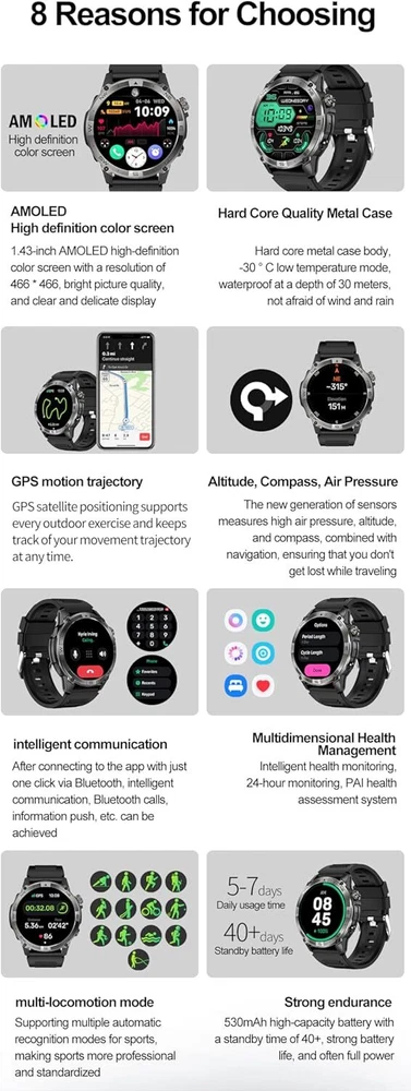 Rugged GPS Smartwatch for Men with 1.43" AMOLED Always-On Display Experience precision and durability with this rugged GPS smartwatch designed for men who love adventure and fitness. Key Features: 1.43" AMOLED Display: Vivid 466×466 resolution with always-on mode for clear visibility anytime. Built-in GPS & Outdoor Sensors: UC6228CI GPS, compass (QMC6308), altimeter, and barometer for accurate navigation and environment tracking. Bluetooth 5.3 Calling & Voice Control: Make and answer calls directly on your wrist. Hands-free voice assistant support. Offline Alipay Payment: Seamless payments without phone connectivity. Advanced Health Monitoring: Real-time heart rate, SpO2, blood pressure, sleep, stress monitoring, plus breathing exercises and sedentary alerts. Durable & Waterproof: IP68 rating protects against water, sweat, and dust for all weather conditions. Long Battery Life: 530mAh battery offers 5–7 days use, up to 30 days standby, with magnetic charging cable included. Multi-Language Support: Supports 20+ languages including English, Spanish, German, and more. Additional Functions: Music control, step counting, calories tracking, weather forecast, custom dials, world clock, calculator, message push, stress test, breathing training, and more. This rugged smartwatch combines robust outdoor features with comprehensive health tracking to keep you connected and informed on every journey.