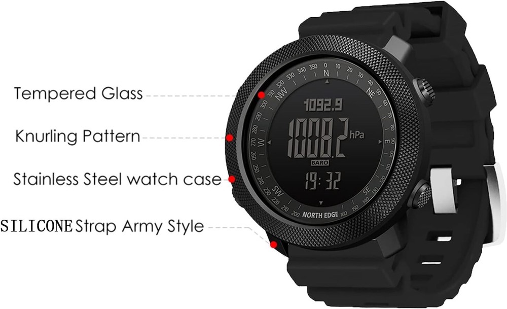 Tactical Watches for Men Digital Outdoor Survival Military Rock Solid Digital Watches with Durable Band, Steps Tracker Pedometer Calories Clasp type Double Pusher Foldover Clasp Item type name Sport Watch Country of Origin China Battery life :18 s Function Brief:Compass, Altimeter,Barometer , Thermometer,Weather Forecast, World Time,Dual Time,Pedometer, calorie, distance record,2 sets alarm,Countdown timer ,Stopwatch, EL Backlight. Materials: Solid metal case with durable and breathable nylon band ,Japenese battery. (CR2032 18s life). Watch Size: Diameter: 50mm/; thickness: 16mm/; width of band: 24mm/; net weight: 117g/ Waterproof: 50M waterproof, means you could wearing it for swimming (not diving), don't push the button when it is under water, also do not wearing it for hot water bath, it will reduce its life span. Package Include: Watch X1; manual X1, packed in a black square gift box. Product details Clasp type Double Pusher Foldover Clasp Item type name Sport Watch Country of Origin China About this item Battery life :18 s Function Brief:Compass, Altimeter,Barometer , Thermometer,Weather Forecast, World Time,Dual Time,Pedometer, calorie, distance record,2 sets alarm,Countdown timer ,Stopwatch, EL Backlight. Materials: Solid metal case with durable and breathable nylon band ,Japenese battery. (CR2032 18s life). Watch Size: Diameter: 50mm/; thickness: 16mm/; width of band: 24mm/; net weight: 117g/ Waterproof: 50M waterproof, means you could wearing it for swimming (not diving), don't push the button when it is under water, also do not wearing it for hot water bath, it will reduce its life span. Package Include: Watch X1; manual X1, packed in a black square gift box. See more About this item