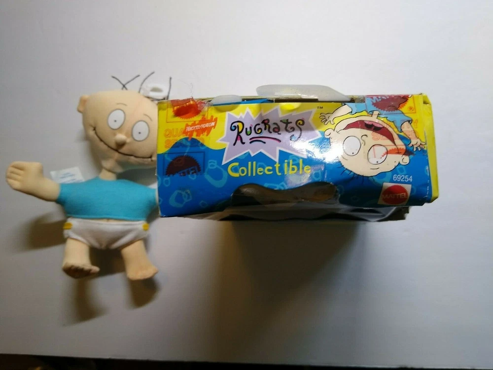 This is a set of two Rugrats plush figures from Mattel, featuring Tommy in his iconic blue shirt and red shorts, and a cute baby animal friend. The figures are still in their original packaging with tags from 1997, making them a great addition to any collection. The colors are vibrant and the attention to detail is impressive, capturing the spirit of the beloved Nickelodeon cartoon. These figures are perfect for fans of all ages and would make an excellent Christmas gift. Set of (2) items. (1) boxed vintage 1997 Rugrat collectible Tommy figure. And (1) Tommy plush figure with tags. Official Nickelodeon items made by Applause. This item has a dark spot of back as shown. Otherwise nice with hang tag. 6.5" tall. The boxed figure has lots of age wear with crushes, dings, sticker wear, creases, and some torn areas. 6.25" tall. Still has the plastic hanger on top with two of the three official tape seals in place so it was never opened. More vintage collectible items for sale in our store. Please review all the photos. Thank you.