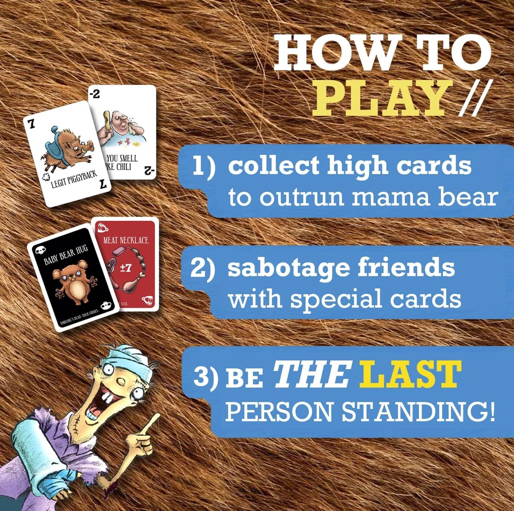 RUN! is the hilarious new card game that simulates fleeing from a hungry grizzly bear with your friends! The higher your card total, the faster you will be. Sabotage your family and friends with negative cards like "meat necklace" and "chum cologne" as you try to outrun them all! Remember, you don't have to be the fastest runner, just don't be the slowest. The last player standing wins! Each game comes with 104 full-color cards, 24 life chips, 2 ghosting sticker sheets, and 1 instructional booklet. Wildly Fun for Families: Bring the family together over belly laughs and friendly sabotage! This hilarious card game will have everyone competing to win at game night. Quick & Intuitive Gameplay: The rules are easy to learn, and play is simple. Fast-paced and engaging, this family card game for and adults is easy for all ages 8+. The average game lasts 15 to 30 minutes. Perfect Gift for : Looking for card games ages 8-12? Family card games for and adults? Or maybe you're looking for the top, best family games 2024? Unwrapping this card game will surely knock their socks off! Extremely Portable & Travel-Friendly: Small in size, this compact game is easy to pack and light to carry. Whether you’re going on vacation or setting up camp in the backyard, this board game for teens and travels easily with you! Check Out the Expansion Pack: If you like playing funny family games, then you’ll love the Grizzly Bear Expansion Pack! These extra cards promote even more extreme gameplay and fun competition. Find it here: https:///Havenhurst-Press-Card-Grizzly-Expansion/dp/B0D8WNBC39/
