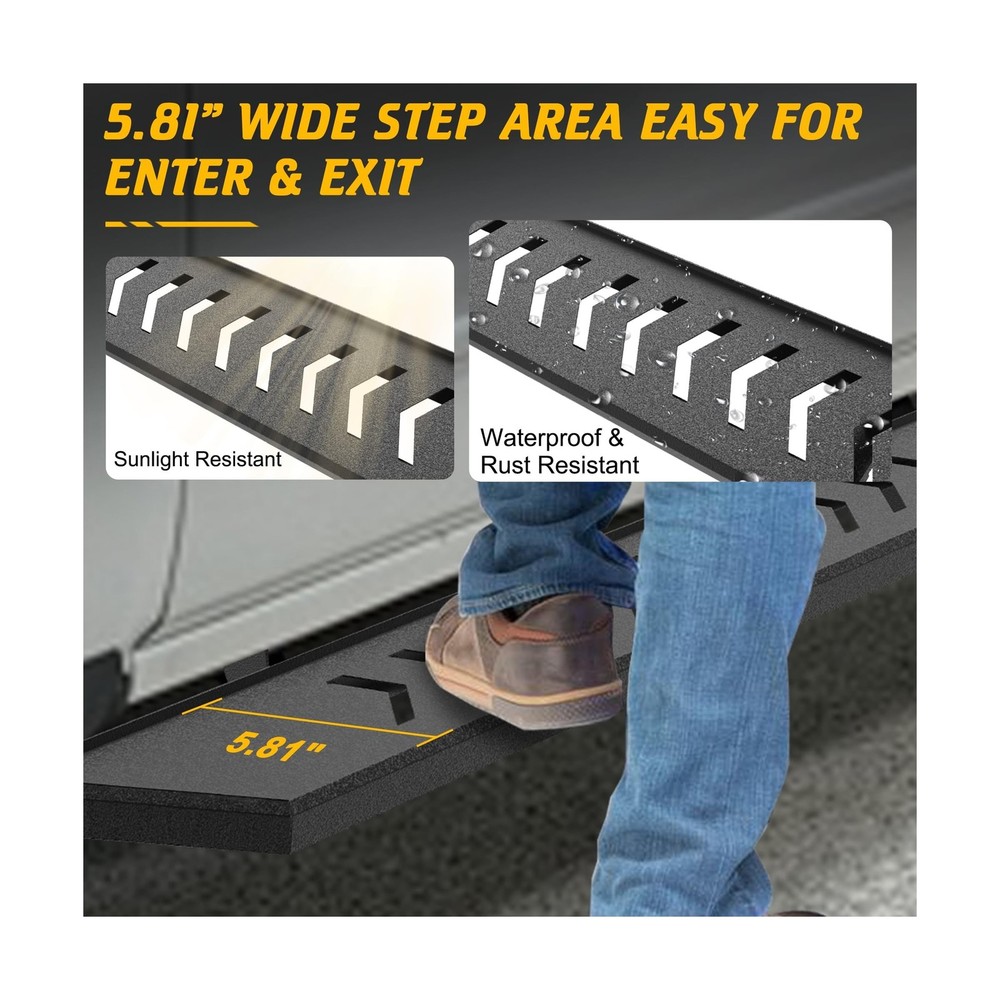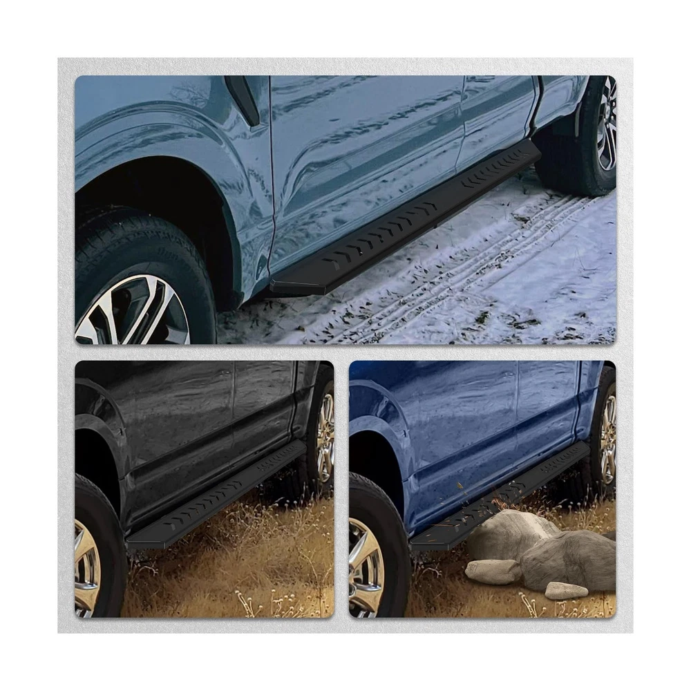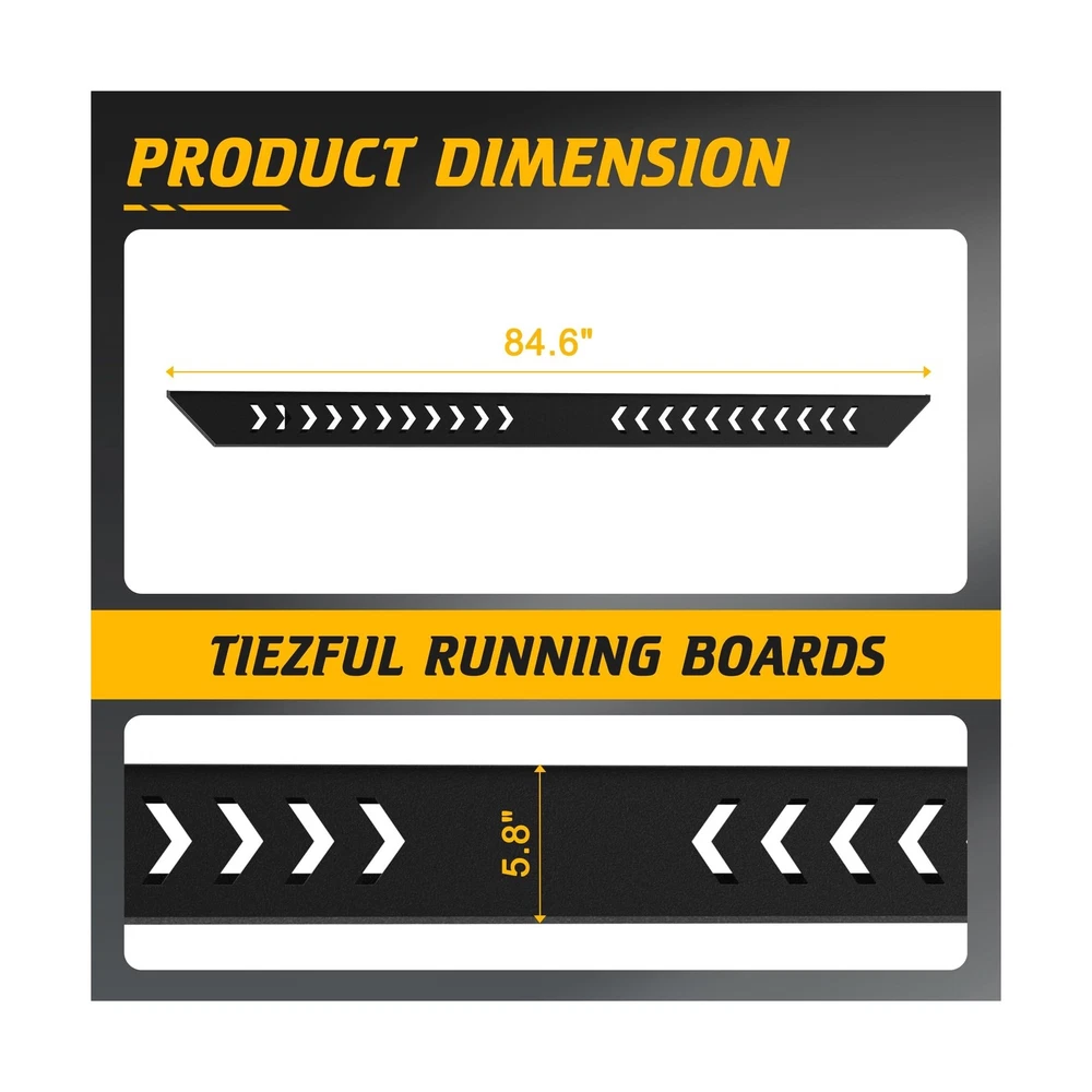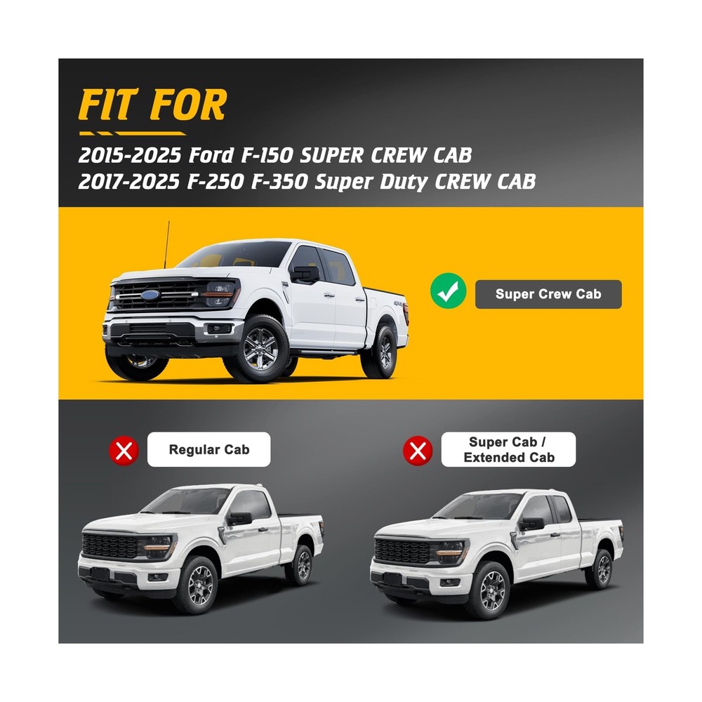 Running Boards Compatible with Ford F150 2015-2025 SuperCrew Cab 4 Full Size Doors, Anti-Slip Side Steps Fit for F250 F350 2017-2025 Super Duty Crew Cab, Texture Black Nerf Bars Steps Description Features: Durable Carbon Steel Construction: Made from high-quality carbon steel, these running boards support up to 500LBS. The power-coated finish resists rust, ensuring long-lasting durability and a sleek appearance Enhanced Accessibility: Featuring a 6-inch wide side steps design, these running boards provide a safe and convenient solution for the elderly, children, and pets to easily enter and exit your vehicle. Also ensures a certain distance from the ground to facilitate access to all types of rough roads All-Season Work:Whether navigating rain, snow, or mud, the anti-slip treads keep your footing secure. The satin-black finish complements your trucks look, while the seamless construction resists dirt buildup. Elevate functionality without sacrificing style No-Drill Installation: Transform your vehicle in under half an hour! Our side steps come pre-drilled to align perfectly with factory mountsno cutting or welding required. The side steps are pre-assembled with 6 heavy-duty brackets, and the kit includes all necessary bolts and illustrated instructions for a DIY-friendly setup. Ideal for both novice and experienced users Product Details: Color: Black Running Boards Brand: TIEZFUL Material: Carbon Steel Exterior Finish: Black Power Coating Finish Item dimensions L x W x H: 86 x 5 x 5 inches Vehicle Service Type: Fit for Ford F150 SuperCrew Cab 2015-2025 & F250 F350 Super Duty Crew Cab 2017-2025 Weight Limit: 500 Pounds OEM Part Number: Fit for 2015 2016 2017 2018 2019 2020 2021 2022 2023 2024 2025 Ford F150 SuperCrew Cab Fit for 2017 2018 2019 2020 2021 2022 2023 2024 2025 F250 F350 Super Duty Crew Cab See more Automotive Fit Type: Vehicle Specific Fit Manufacturer: TIEZFUL Color: Black Running Boards Brand: TIEZFUL Material: Carbon Steel Exterior Finish: Black Power Coating Finish Item dimensions L x W x H: 86 x 5 x 5 inches Vehicle Service Type: Fit for Ford F150 SuperCrew Cab 2015-2025 & F250 F350 Super Duty Crew Cab 2017-2025 Weight Limit: 500 Pounds OEM Part Number: Fit for 2015 2016 2017 2018 2019 2020 2021 2022 2023 2024 2025 Ford F150 SuperCrew Cab Fit for 2017 2018 2019 2020 2021 2022 2023 2024 2025 F250 F350 Super Duty Crew Cab Automotive Fit Type: Vehicle Specific Fit Manufacturer: TIEZFUL Model: Fit for Ford F150 2015-2025 SuperCrew Cab & F250 F350 2017-2025 Super Duty Crew Cab 4 Full Size Doors Product Dimensions: 86 x 5 x 5 inches Item model number: TZ8203 Manufacturer Part Number: 8203 Special Features: Accessibility, Heavy-Duty Durability, Matte Black Finish, anti-slip, rust-resistant Date First Available: June 5, 2025 Delivery We Do Not Ship Outside of the Continental US. Return Policy All items qualify for returns within 30 days of receipt. Seller is responsible for return shipping on any item that is not damaged. Feedback We take our reputation seriously, we buy and sell online, so we understand the value of trust. If you are unsatisfied with your order, please contact us and we will work with you to resolve it to your satisfaction.