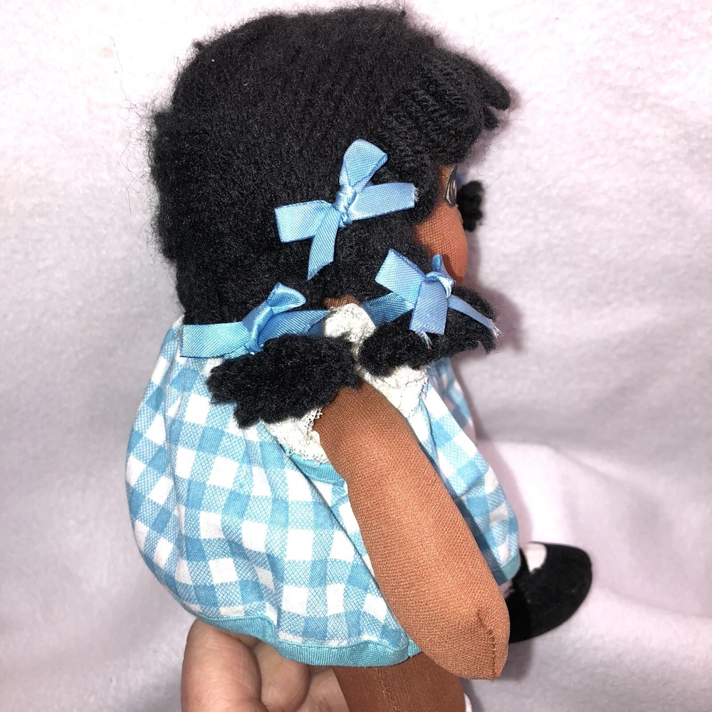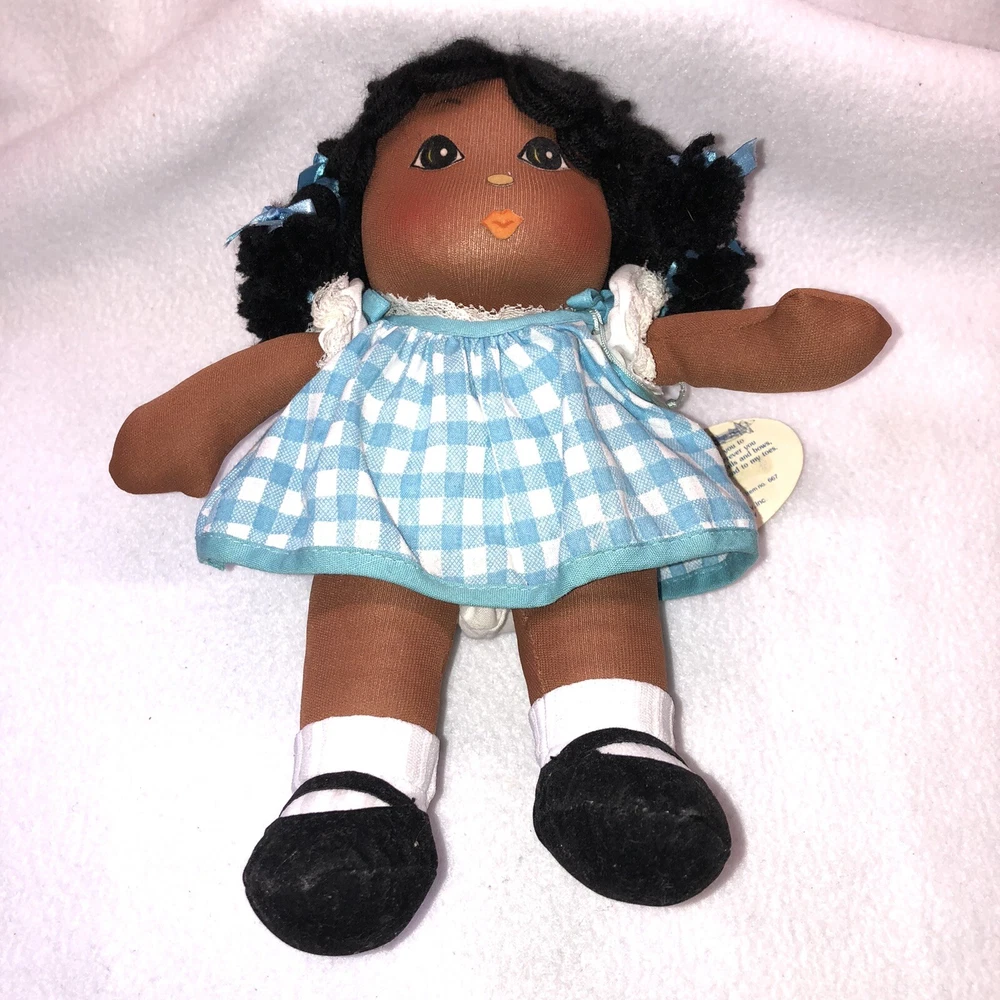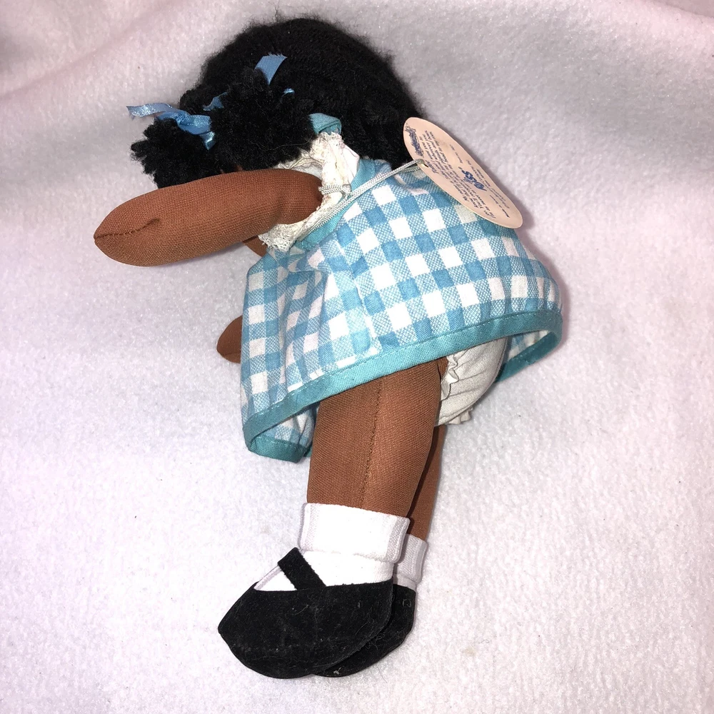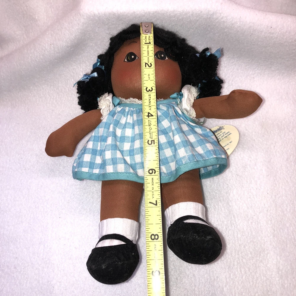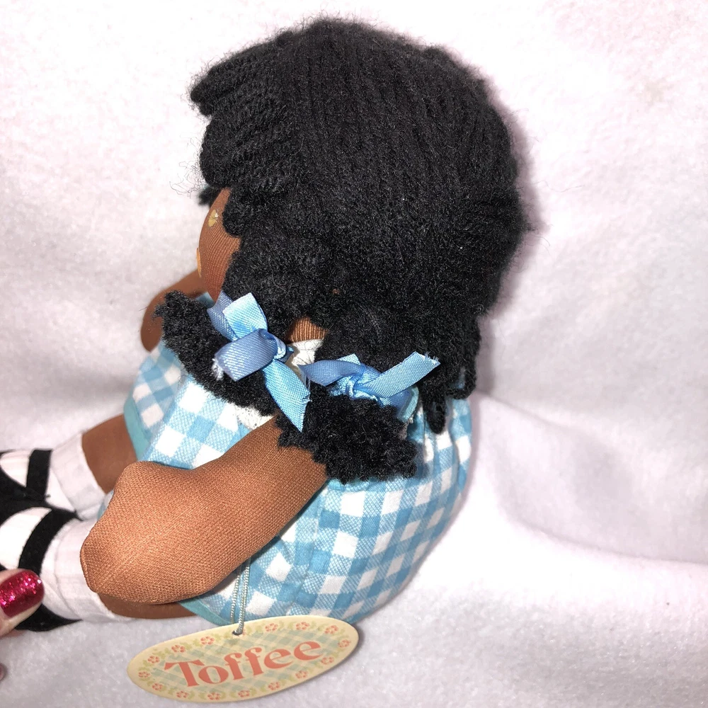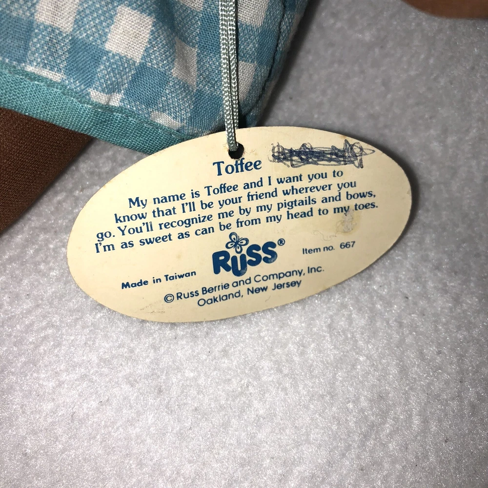 This is a sweet vintage doll from Russ Berrie and Company Inc. She is named "TOFFEE" and she comes dress in a blue and white checkered dress with a white undergarmet that is trimmed in lace that peeks out of the arm holes and neckline. She has white socks and black shoes that are attached. Her hair is black yarn that is braided into four pigtails and I believe her head is styrofoam under the fabric. Toffee's original Russ tag reads "My name is Toffee and I want you to know that I'll be your friend wherever you go. You'll recognize me by my pigtails and bows. I'm as sweet as can be from my head to my toes." She measures approximately 9 inches tall and is about 8 inches from tip of her hand to the tip of her other hand and is number 667. If I had to guess, I would date her to the 1970's. Doll is in good vintage pre-owned condition. She appears to be missing one blue bow on her left side (see 2nd photo). There are three on the right and I am assuming they were symmetrical and there should be three on the left. She comes with her original Russ tag still attached. There is some writing on the back of the tag (see 7th photo). I did note a small spot on the back of her dress near the hem (see last photo). Please review and enlarge all photos as they contain additional details, views and measurements. Shipped via USPS Ground Advantage.