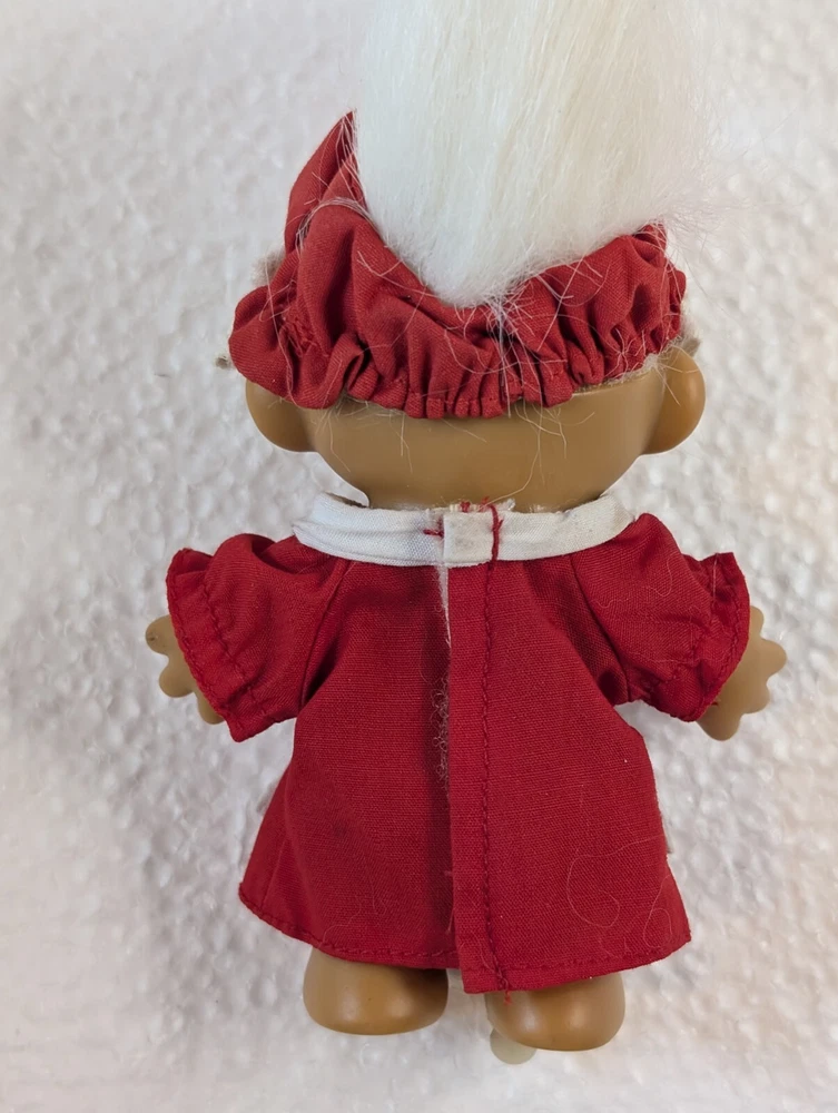 Embrace the festive spirit with the charming Russ Berrie Troll Mrs. Claus figurine. At 5 inches tall, this delightful character is decked out in her signature red and white, complete with a holly apron, exuding the warmth and cheer of Christmas. Crafted from durable vinyl, this piece captures the whimsy of the holiday season and is a treasured addition to any collection. Whether displayed on a mantel or nestled among your holiday decor, this medium-sized, multicolored figurine is suitable for both adult and kid audiences, making it a versatile gift or a quaint keepsake. It's a genuine original, complete with the original Russ sticker on its foot, celebrating its vintage appeal and the joy of the yuletide season.