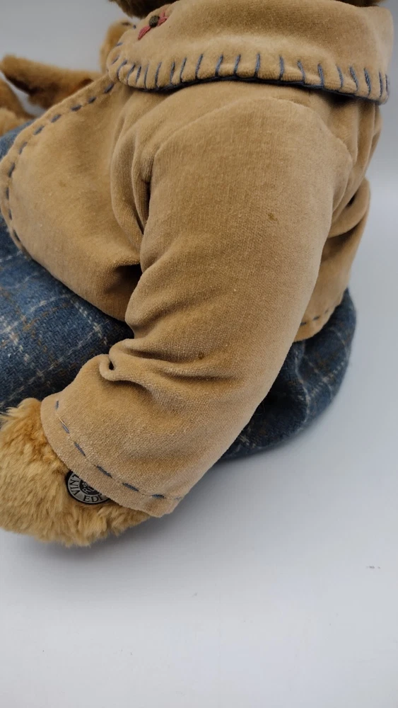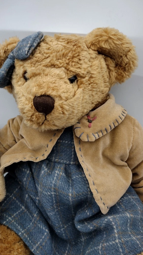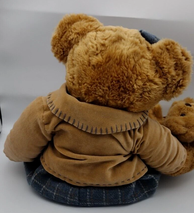 This adorable vintage edition bear measures approximately 14" in height. The bear is holding a baby teddy bear; she is wearing a blue dress with a blue bow. It has its tag attached by a metal button. Too cute and nicely weighted! Shipped with USPS Ground Mail.