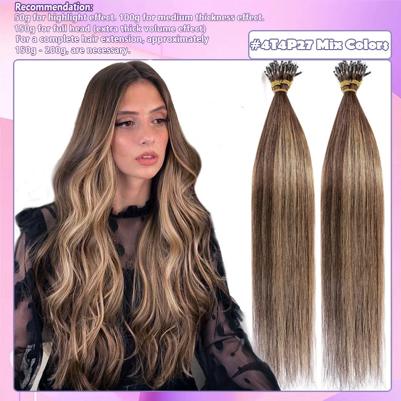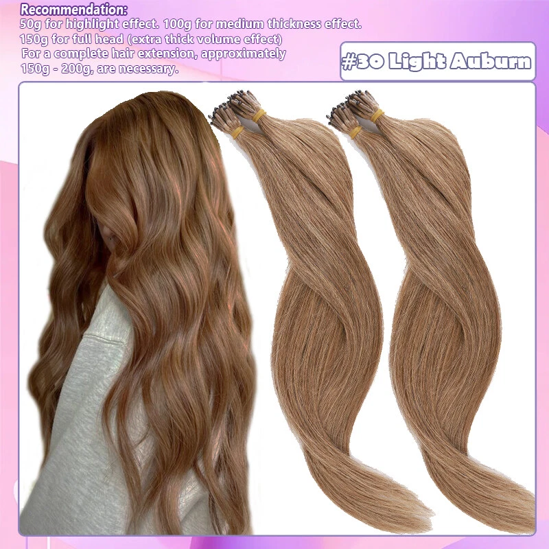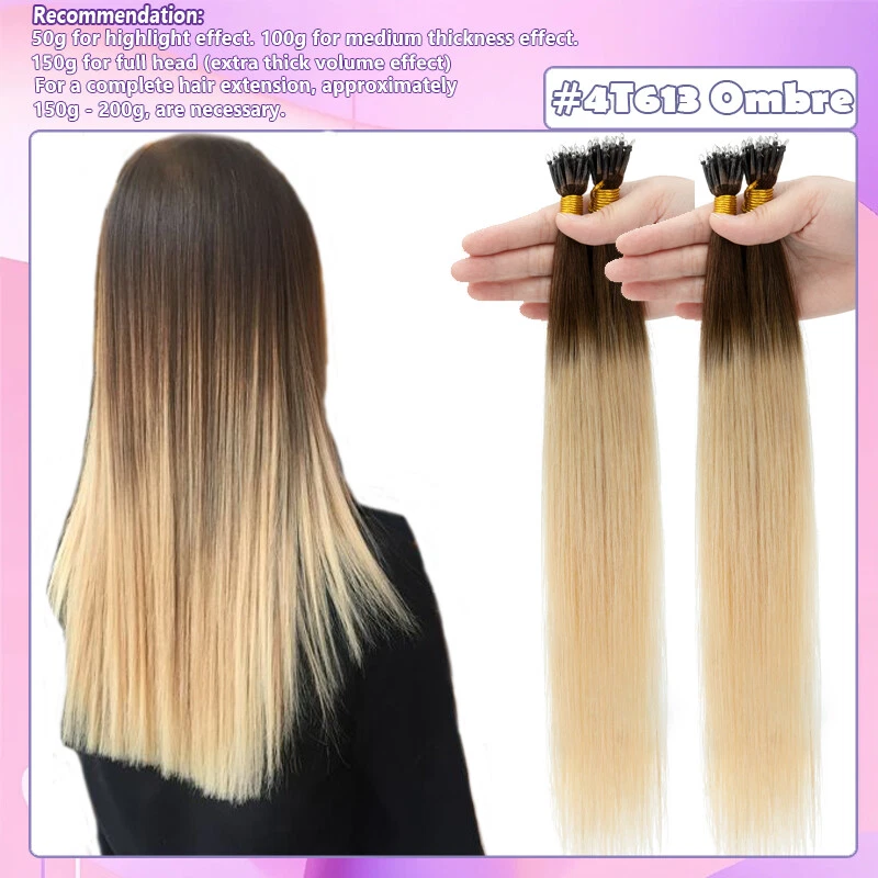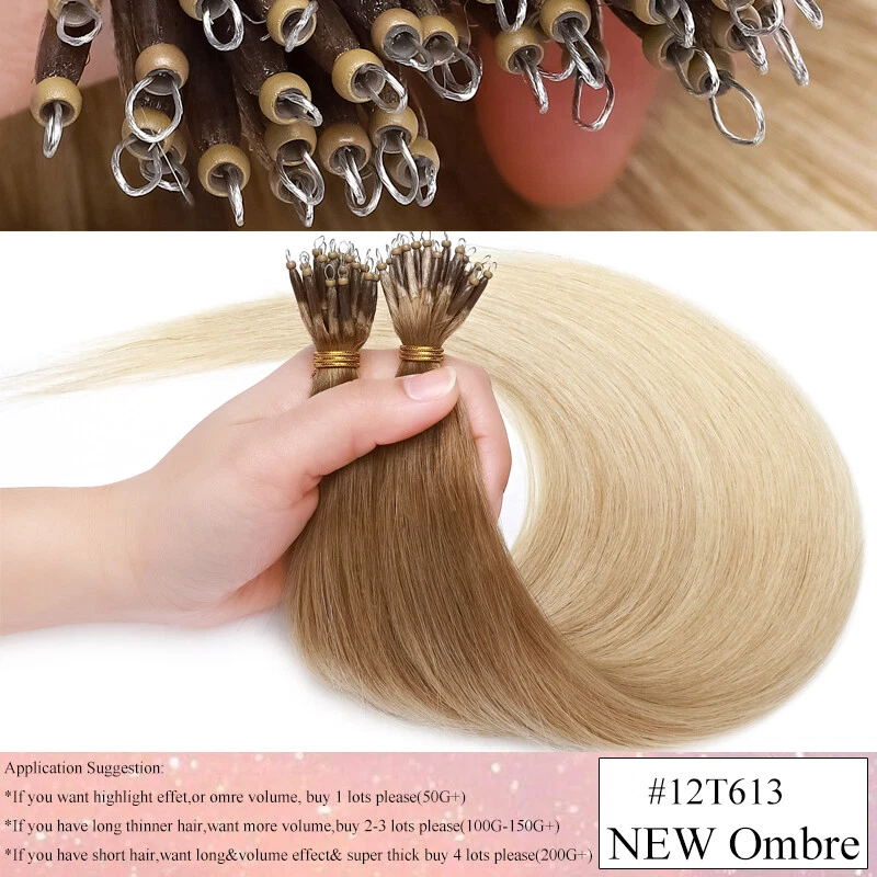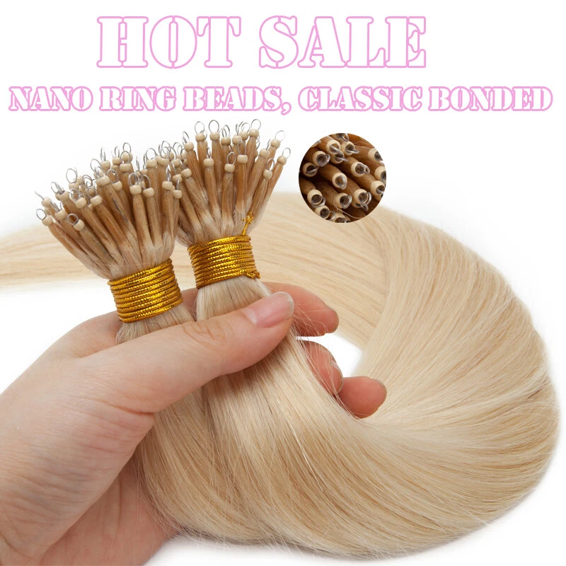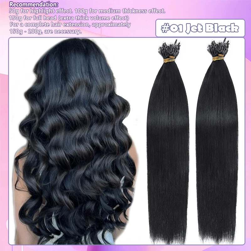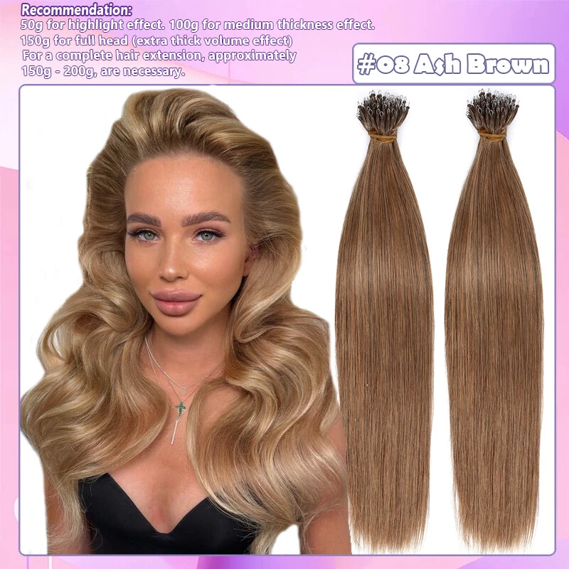 Description Hair Type US TOP QUALITY ---- 100% Human Hair Nano Ring Micro Tips Bead Link Pre Bonded Remy Hair Extensions Length & Weight Weigth / Strand: 0.5 g 1 g/s, 50 g-50 Strands / pack, 100 g-100 Strands / 2 packs, 150 g-150 Strands / 3 packs 16 Inch ~50g / 100g/150g (100% Remy & Soft Hair ) 18 Inch ~50g / 100g/150g (100% Remy & Soft Hair ) 20 Inch ~50g / 100g/150g (100% Remy & Soft Hair ) 22 Inch ~50g / 100g/150g (100% Remy & Soft Hair ) 24 Inch ~50g / 100g/150g (100% Remy & Soft Hair ) Colour #1 - Jet Black #1B - Natural Black #2 - Dark Brown #4 - Medium Brown #6 - Light Brown #30 - Light Auburn #33 - Dark Auburn #60 - Platinum Blonde #613 - Bleach Blonde #27 - Dark Blonde #24 - Natural Blonde #18/613 - Light Ash Brown & Bleach Blonde #4/27 - Medium & Bleach Blonde #12/613 - Golden Brown & Bleach Blonde #99J - Wine Red #4T27(Ombre) - Medium Brown To Dark Blonde #2T6 (Ombre) - Dark Brown To Light Brown Notes: Hair Colors appear on monitor may vary slightly from actual colors due to different display settings. All colors are subject to the actual items. We'll highly appreciate your understanding. Usage Can be dyed, curled, straightened, washed and combed like your own hair. ( Helpful Tips : Only Light colors can be dyed into Dark colors. T ry & dye one piece hair to make sure the hair is not spoiled when dying instead of dying the whole hair extensions. And we don't suggest to dye #60, #613, #70, because they will be broken when dye again. Thank you!) Suitable for lengthening, wedding hairstyles, ponytails and many more options like the own hair. Thickness 1g per strand for example 50 strands = 50 g for high lights and fill in. 100 strands = 100 g for fine thickness hair. 150 strands = 150 g for medium thickness hair. 150 to 200 strands if you have thicker hair. For a complete hair extension, approximately 150g - 200g, are necessary. Life Span 2-6 Months - Long wearing time with good care (depending on care and use) Please adjust the extensions below 120 ° C (248 ° F) Any Problems, please let us know, we‘re ready to solve your problems. Thank you!! Nano Ring Micro Beads hair extensions can be styled as normal and it will lie perfectly straight and will blend with your own hair to create a glamorous look you've always wanted. Very easy to use, no clips, no glue, no heat, no damage to you own hair . The hair extensions feels so SILKY SOFT you will see no difference to your own hair. It would be perfect for strand-by-strand method. We Guarantee our human hair is 100% HUMAN HAIR WITHOUT ANY MIXTURE. We Guarantee 100% BEST CUSTOMER SERVICES!!! Benefit Packages: 1. Free Colour Matching Service 2 . 100% Money Back Guarantee: we offer free replacement or full refund if you are not satisfied with the obtained colour. Payment: We only accept Paypal. Shipment: 1. The item will be shipped by Royal Mail Service. 2. The items will be dispatched within 24 hours after payment received. 3. We offer fast service and the delivery time will be within 1 week. Feedback: If you have any questions or problems with the products, please feel free to contact us. We will reply to you ASAP. We welcome all your feedback. If you are satisfied with the item, please give us your good comments. We appreciate your trust and praise. Refund and Exchange: Please noted that if you require refund or exchange service, items must be in a new condition. Thanks for spending your time in my store, wish you have a nice day!!