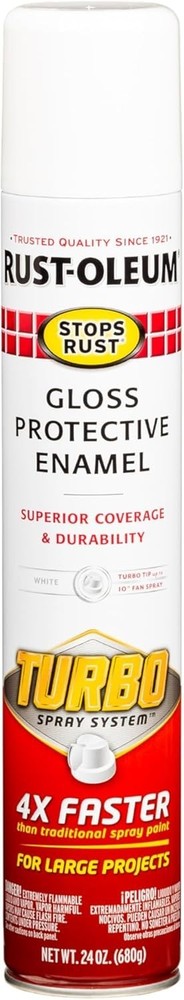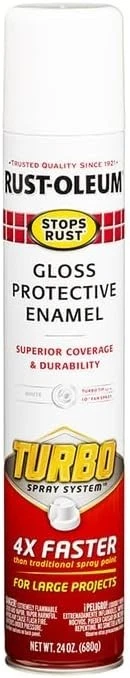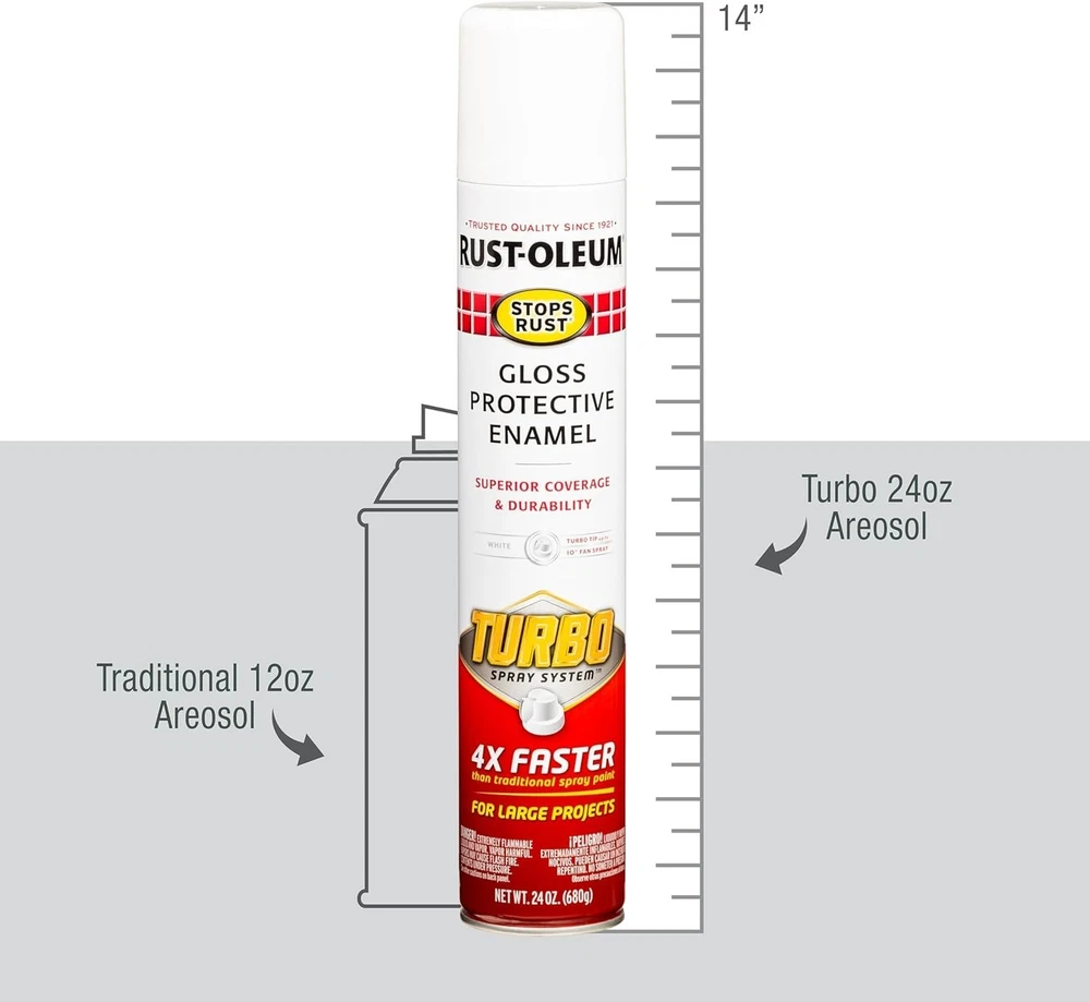 Rust-Oleum Turbo Spray Paint 24 oz Gloss White, Stops Rust, 6 Pack,Fast Coverage About this item Designed for large jobs with 10" tall fan spread for professional spray equipment results and 4X faster project completion Protective oil-based enamel prevents rust and corrosion on metal, wood, concrete and masonry surfaces Dries to the touch in 2 hours, recoat within 1 hour or after 48 hours - covers up to 20 sq. ft. per can Tough resistance to rust, abrasion, fading, chipping and dulling for long term protection Gloss finish provides a strong shine with long lasting durability Product Description Rust-Oleum Stops Rust Turbo Spray System Spray Paint provides the same high quality color and rust protection of the classic Stops Rust brand with an innovative turbo tip. Large 24 oz can features an advanced Turbo Spray System for 4 times the output speed with superior coverage and durability. Using Turbo Spray System replaces the hassle and required clean up from using pro spraying equipment. Designed for large projects, Stops Rust Turbo Spray System uses a super tall fan spread to cover large wood and metal surfaces with ease for a durable gloss finish. See the Difference - Turbo Covers More Per Spray Complete Substantial SaveSaveProjects in a Fraction of the Time! Superior Coverage and Durability The same exceptional quality expected from Rust-Oleum paints delivered faster than ever before. Up to 10" Wide Fan Spray Innovative Turbo Spray System creates an extra wide fan spray for incredible coverage per pass. Great for Large SaveSaveProjects Get the convenience and speed of a spray can with results of a roller or spray system - all in one can!