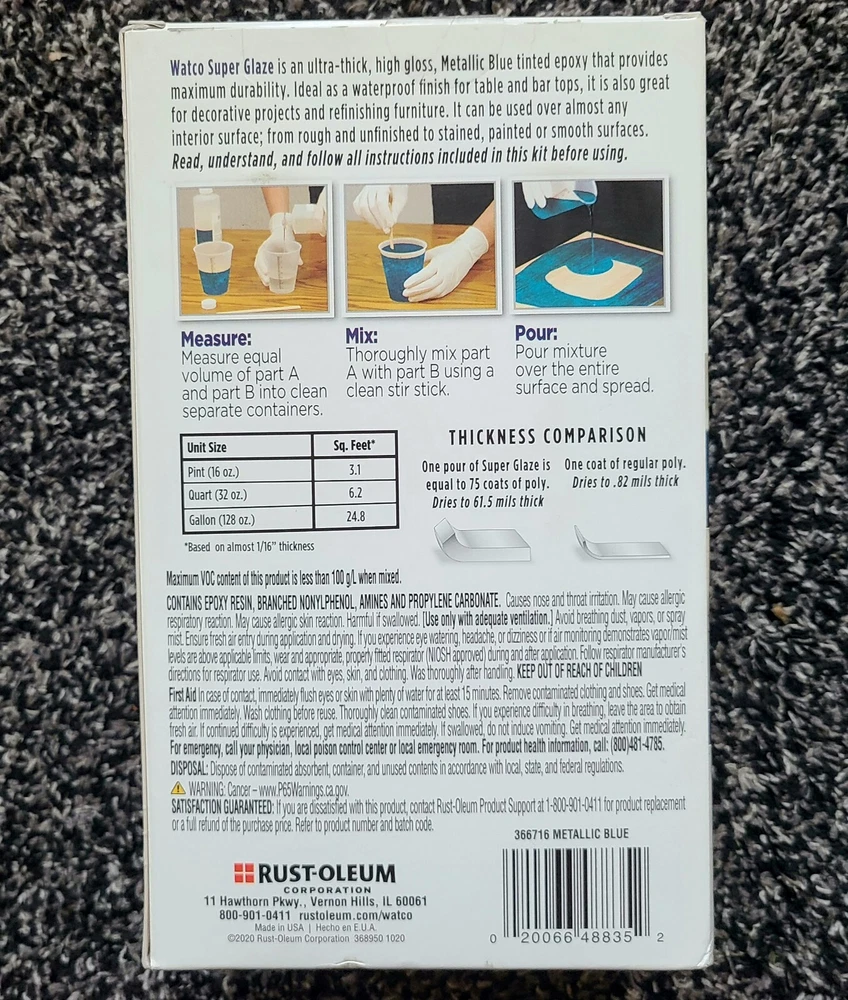 **SHIPS NEXT DAY** **ONE DAY HANDLING** **BEST-PRICE** Add a high-gloss metallic blue finish to your woodwork with Rust-Oleum Watco- Super Glaze Pour On High Gloss Epoxy. This liquid coating is perfect for bare wood, finished wood, old/reclaimed wood, and stained wood. The 1 Quart container size allows for a coverage area of 6.2 square feet, and the gloss sheen adds a stunning shine to your project. This epoxy varnish is oil-based and features a brushroller application method. The product is a waterproofer/sealer with a dry to touch time of 300 minutes and a time before recoating of 1 hour. The Rust-Oleum brand is known for its quality products, and this metallic blue finish is no exception. Ideal for interior use, this coating is a great addition to any home improvement project.