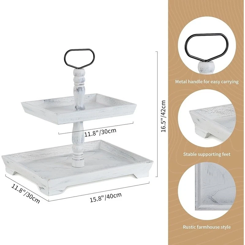 About this item Timeless Farmhouse Elegance : The whitewashed finish of our two-tiered tray serving stand adds a touch of timeless elegance to your home decor. It's the perfect backdrop for displaying cherished items, from cups to candles, plants to picture frames, and everything in between Versatile Celebration Hub : Our 2-tiered tray decor is the heart of every celebration. Whether it's Valentine's Day or Thanksgiving, this farmhouse tiered tray stand is your go-to for seasonal charm. It's the centerpiece that adapts to every festive mood, making your decor pop with rustic appeal Maximize Space, Enhance Aesthetics: The decorative tiered display stand's rectangular design is both space-efficient and aesthetically pleasing. It offers more room for your decor while taking up less counter space. This smart, farmhouse-style stand can hold up to 30% more, making it the perfect addition to any room Perfectly Sized for Display: With dimensions that allow for ample display space, our tray stand ensres that your decor items are the stars of the show. The bottom tray's 15.8"x 11.8" and the top tray's 11.8"x 8.7" provide plenty of room, while the 15.8" height and 7" gap between trays accommodate even taller pieces Rest easy knowing our uwavering commitment to support is just a message away, with a promise to resolve your queries within 24 hours. Purchase with complete confidence! Brand: Color: White Material: Engineered Wood Product Dimensions: 15"L x 12"W x 1.9"H Shape: Rectangular
