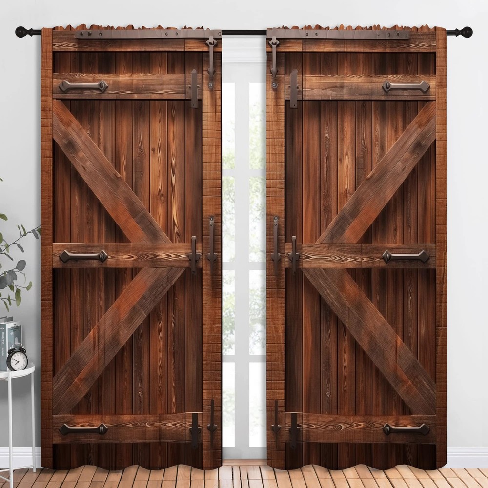 Package Included: · Blackout window curtains 2 Pcs set ( two panels). Curtain features: · Light and UV blocking. · Block more than 90-100% of sunlight (dark colors are better). · Reduce noises from busy streets and high traffic areas. · Protect furniture from sun damage and fading. · Provides complete privacy when needed. · Blocking street lights and car lights at night will darken your bedroom, make it easier for you to fall asleep, and always block UV rays. Unique design: · Our curtains are different from ordinary curtains. These fashion print decoration window curtains are perfect for Living room, bedroom, kids room, kitchen, yard, patio, parlor, with Art pattern decoration in various styles. Material: · 100% polyester. · Our Blackout Curtain Liners are crafted from a durable soft and thick triple weaved blackout fabric which can block out sunlight and UV rays. The darker color of the fabric, the more light it can block. Easy Care Instructions: · Machine washable in cold water · Do not bleach. · tumble dry on low · low temperature ironing 100percentage Satisfaction Guarantee: · Your purchase includes an extended 30 days warranty. · If you have any question, please don’t hesitate to contact us.We will provide you with the most intimate and professional service. Notes: · For your curtains to be more perfect, please choose a size 5-10 Inch larger than the actual window width. · that due to the influence of light and screen, slight chromatic aberration should be acceptable. If you have any questions about the product, please feel free to contact us. ✿【What do you get?】: Each package contains 2 curtains, each measuring 42 "W x 84 "L. The total size of the two curtains is 84 "W x 84 "L with a 3" rod pocket on top. come unpacked and ready to use. ✿【Fashion Design】: Featuring a "Barn Wood Doors themed print with a "Rustic Brown Retro Farmhouse Doors design, These curtains will enhance room decor. for kitchens, bedrooms, living rooms or any room. ✿【High-Quality Material】: curtains are made of 100% microfiber for a beautiful look and soft feel. are printed with reactive dyes to vibrant colors won't fade. and safe for your family's health. ✿【Functional Benefits】: Our blackout curtains keep out the 80-90% SUNLIGHT and UV RAY.Your furniture and artworks can be protected from.helping to maintain a comfortable temperature in your room. ✿【Care is easy】 These soft window treatment panel is machine washable. dryer without worrying about the color fading or the need for ironing. The material is wrinkle-resistant making.