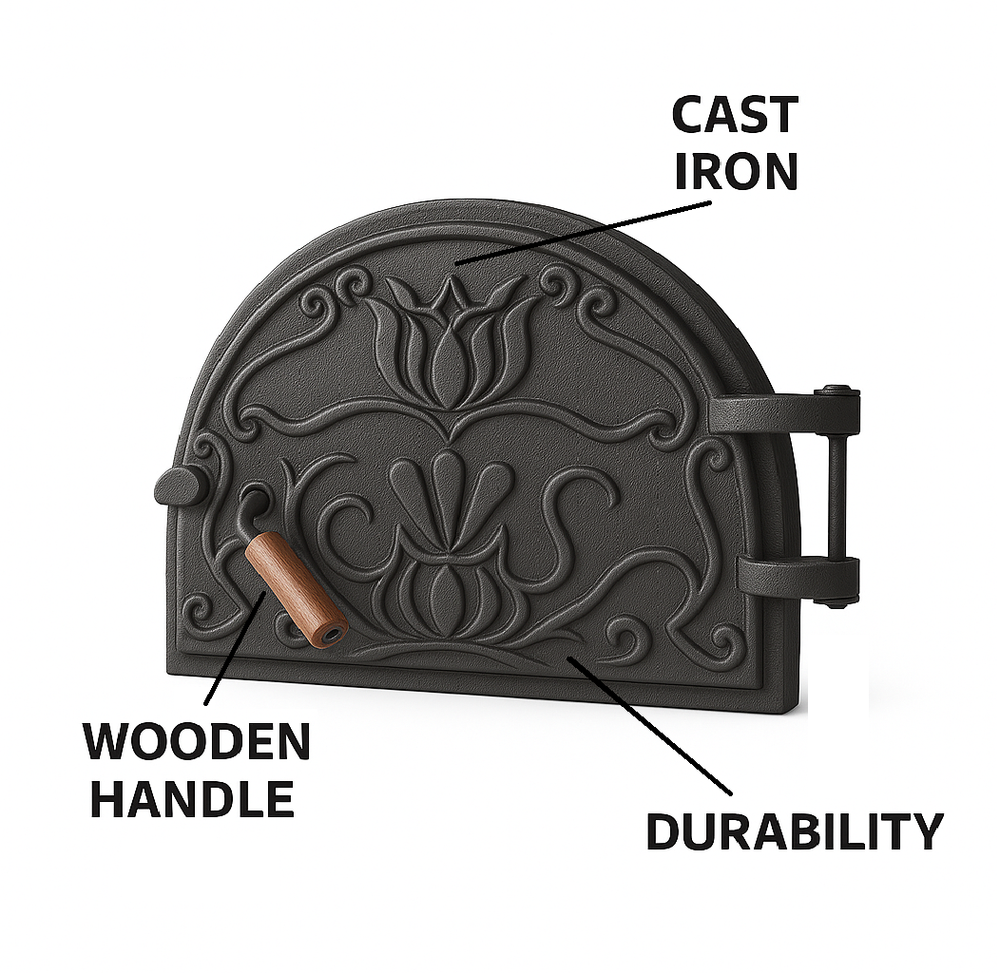 ✅ Description Upgrade your wood-fired oven with this carved cast iron door , designed for both functionality and aesthetics. With its elegant carved pattern and matte black finish, this oven door not only withstands extreme temperatures but also adds a traditional touch to your outdoor cooking area. Perfect for BBQ enthusiasts and wood-fired oven setups, it offers durability, heat resistance, and style in one piece. Specifications: Material: Cast Iron Color: Black Heating Method: Conduction Fuel Type: Wood / Charcoal Dimensions: 18.11" W x 12.6" H ✅ Highlights Elegant carved cast iron oven door for wood-fired ovens Heavy-duty design ensures long-lasting durability Withstands high temperatures for perfect cooking results Adds rustic style to your outdoor cooking setup Size: 18.11" W x 12.6" H | Matte black finish