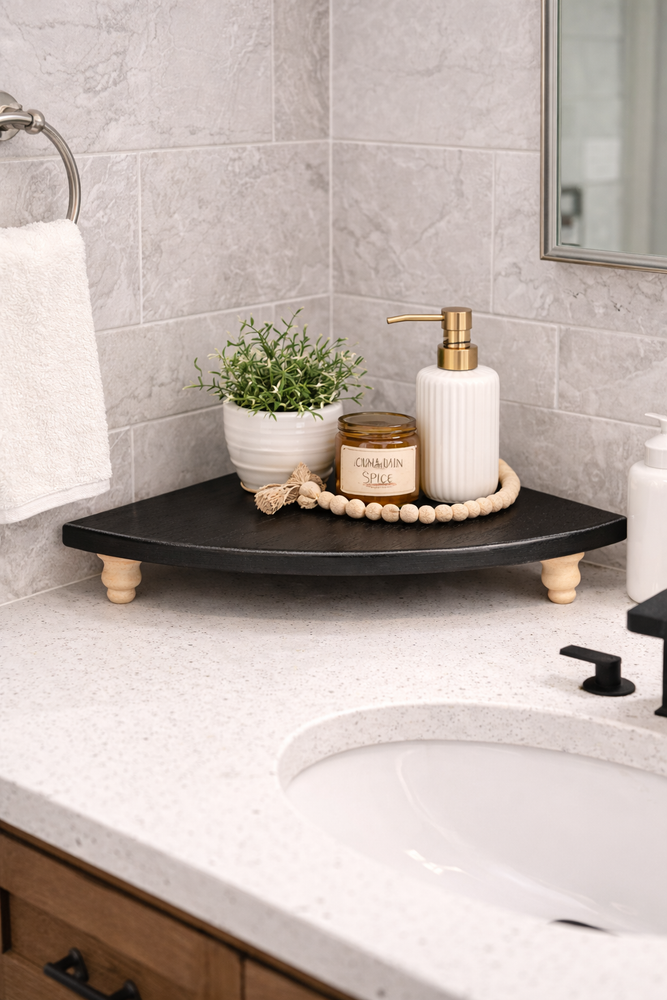 Add height, warmth, and farmhouse charm to any corner space with this beautifully styled rustic wooden corner riser . Designed to fit perfectly into countertop corners, this piece instantly elevates everyday décor while keeping surfaces organized and intentional. Perfect for kitchens, bathrooms, coffee bars, entryways, or shelves, this riser is ideal for displaying candles, soap dispensers, plants, seasonal décor, or small accents. The black wood top with natural wood feet creates a modern farmhouse look that blends effortlessly with neutral, rustic, or contemporary interiors. Whether you’re styling a coffee station, bathroom sink, or decorative nook, this riser adds dimension and function without taking up valuable space. 📏 Dimensions (From Image) Front Width: 39.5 cm / 15.5 inches Side Depths: 28 cm / 11 inches each side Overall Height: 5 cm / 1.96 inches Top Thickness: approx. 1.5 cm / 0.59 inches (Corner triangle design — fits snugly into countertop corners) 🪵 Material & Finish Solid wood construction Matte black painted top Natural wood feet Rustic farmhouse finish Freestanding design 🏡 Ideal Uses ✔ Kitchen corner riser ✔ Bathroom sink organizer ✔ Coffee bar display stand ✔ Farmhouse countertop décor ✔ Candle or plant stand ✔ Shelf or table riser 📦 What’s Included 1 × Wooden Corner Riser (as shown) Accessories shown in photos not included 🚚 Shipping & Handling Ships securely packaged Ready to use out of the box Free shipping if applicable per your listing settings Item Specifics Condition: New Type: Display Riser / Stand Shape: Corner Triangle Material: Wood Color: Black & Natural Wood Style: Rustic, Farmhouse, Modern Room: Kitchen, Bathroom, Entryway, Living Room Mounting: Free Standing