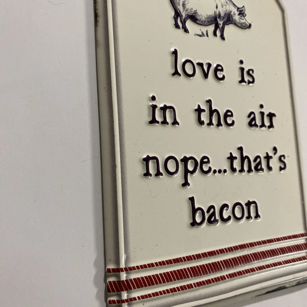 Add a touch of rustic charm to any room with this decorative tin wall sign. The distressed beige finish and novelty shape make it the perfect addition to your home decor. Featuring a playful pig subject and the humorous phrase "love is in the air...nope that's bacon", this 6"x4" sign is sure to bring a smile to your face. Ready to hang and easy to display, this sign is made of high-quality tin and boasts a smooth, decorative finish. Perfect for any room or kitchen, it is suitable for teens, adults, and kids alike. Add this vintage-style sign to your collection today and bring a little bit of farm life into your home.
