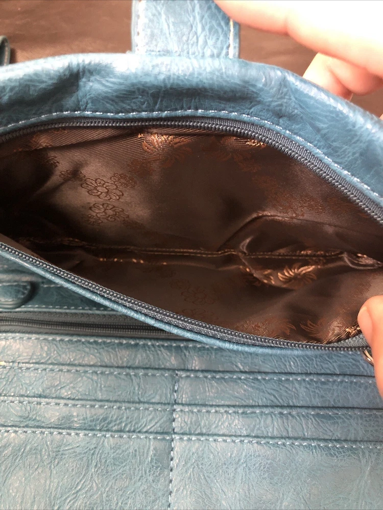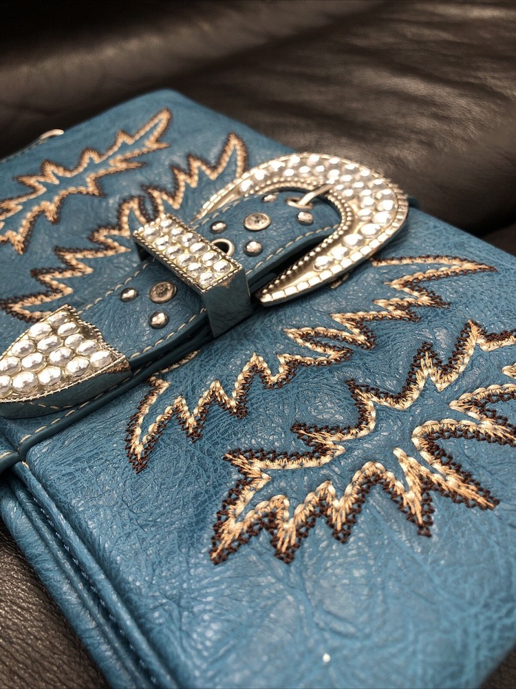 Rustic Coutures Blue Studded Belt Buckle Wallet This Wallet is “Like New Condition” This Wallet has possibly never been used. -one small area peeling shown in picture -Outside buckle and zipper for looks Measurements: 9.75”x 5.25” Features: -Beautiful Studded Belt Buckle - Embroidery on front -6 credit card pockets -One pocket possible checkbook pocket -2 zipper inside pockets -Wristlet belt #8aAS1