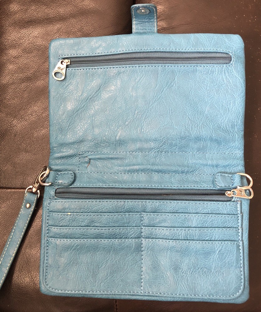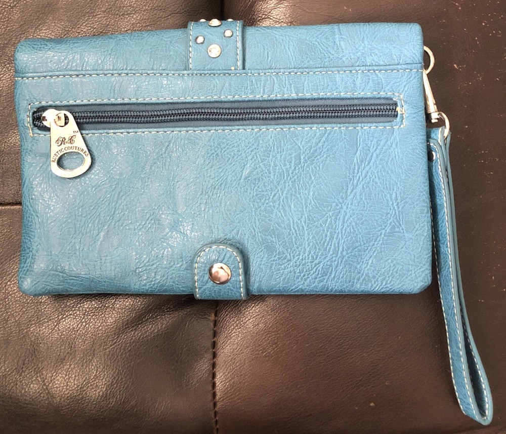 Department: Women Material: Faux Leather Style: Wristlet Color: Blue Features: Credit Card, Folding, Checkbook Brand: Rustic Coutures Accents: Studded Type: Wallet