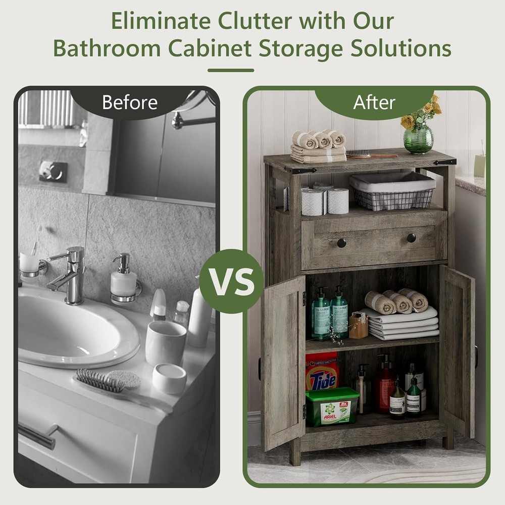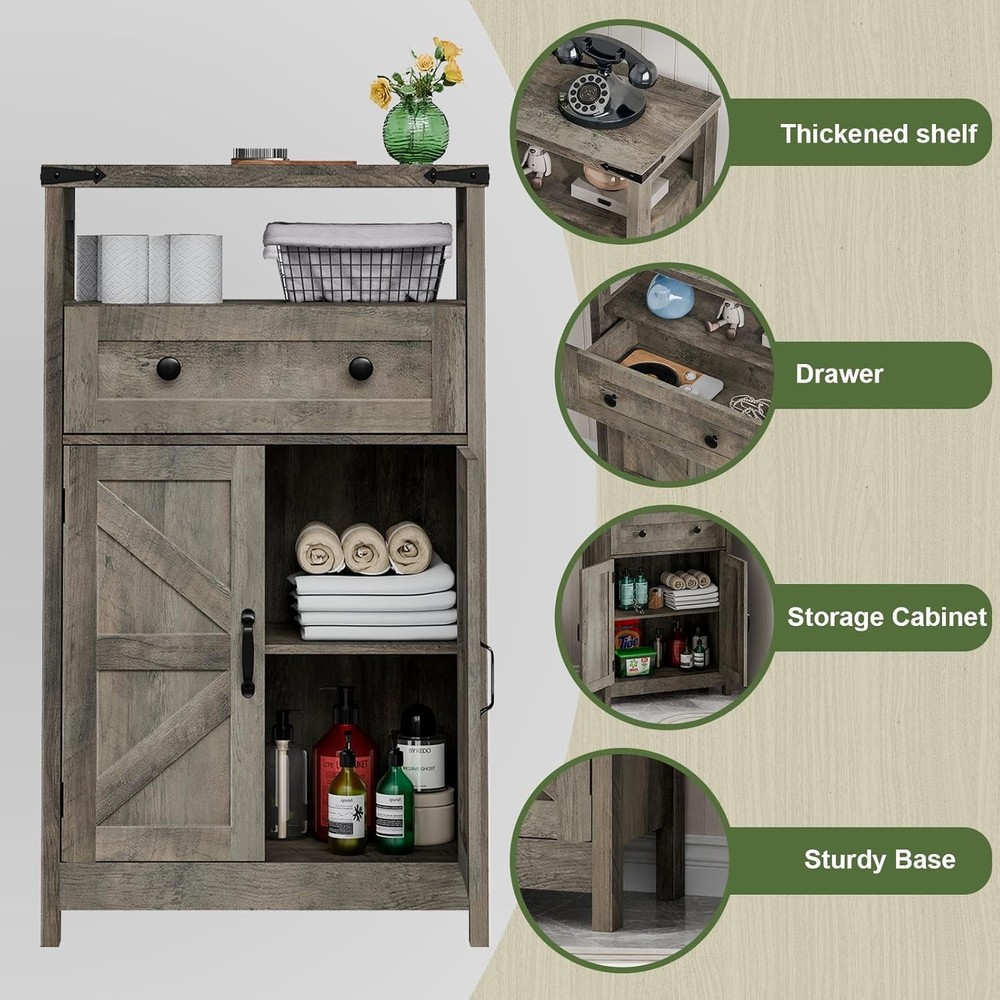 Small Cabinet with Drawer - Side Storage Organizer, Farmhouse Rustic Style, Grey for Bathroom, Kitchen, Living Room Product Description About this item 🌳【Sturdy and Durable Construction】 Our bathroom storage cabinet features a thickened top board, ensuring excellent weight-bearing capacity and durability. This robust construction makes it perfect for holding heavy items such as toiletries, decorative pieces, or even small appliances, adding both function and style to your bathroom. 🌳【Open Storage Space】Just below the top board, the cabinet boasts an open storage space that is ideal for quick access to everyday essentials. Whether you need to grab a towel, your favorite skincare products, or other bathroom necessities, this easily accessible area helps keep your space organized and clutter-free. 🌳【Spacious Middle Drawer】 The large middle drawer provides ample storage for a variety of items. It’s perfect for storing smaller, less frequently used items out of sight yet within easy reach. The smooth sliding mechanism ensures effortless operation, making it convenient to access your belongings whenever needed. 🌳【Adjustable Shelving】 The bottom storage cabinet includes an adjustable wooden shelf, allowing you to customize the storage space according to your needs. This feature is ideal for accommodating items of different sizes, from tall bottles to stacked towels, providing versatile storage solutions tailored to your preferences. 🌳【Elegant and Functional Design】 Combining functionality with a sleek design, our bathroom storage cabinet seamlessly integrates into any bathroom decor. Its modern aesthetic, coupled with practical storage options, not only enhances the look of your bathroom but also adds convenience to your daily routine, keeping everything tidy and in its place. Bathroom Storage Cabinet Upgrade your space with our versatile bathroom storage cabinet. Farmhouse Storage Cabinet Bathroom Storage Cabinet Transform your bathroom into an organized and stylish oasis with our premium bathroom storage cabinet. Crafted with a thickened top board, this cabinet ensures unmatched durability and impressive weight-bearing capacity, perfect for displaying your favorite decor or holding everyday essentials. Beneath the sturdy top lies an open storage space, providing easy access to frequently used items, keeping your bathroom clutter-free and beautifully arranged. Feature Metal Handle Large Capacity Drawer Adjustable Board Thickened Top Shelf Versatile and stylish storage for any room.